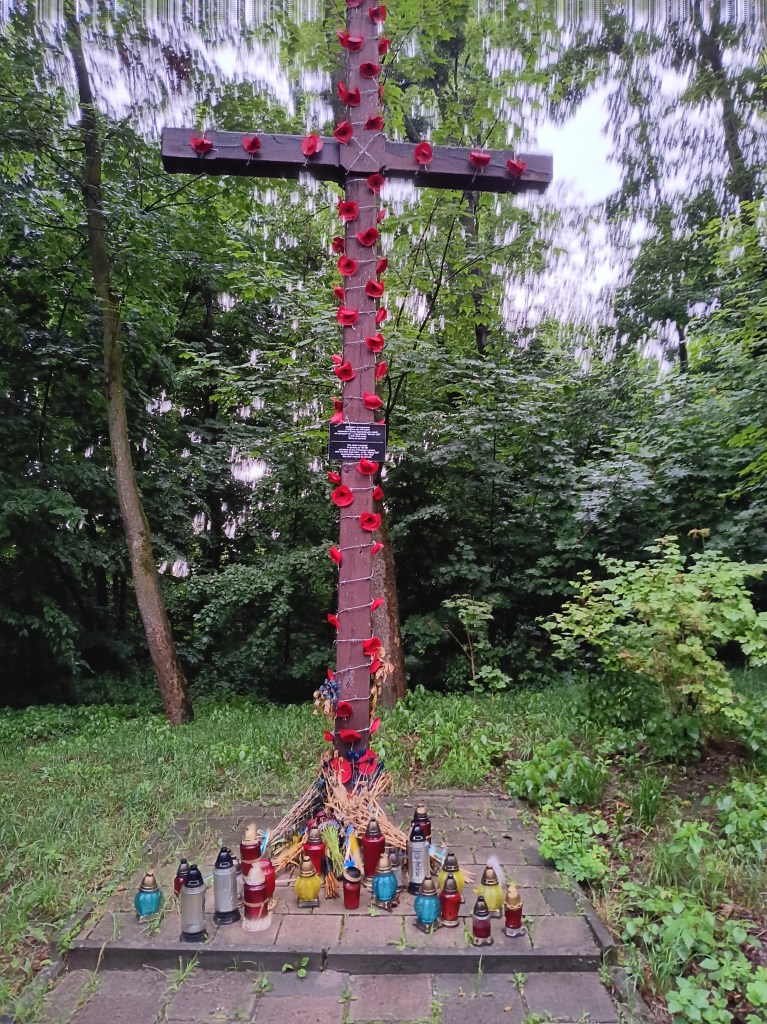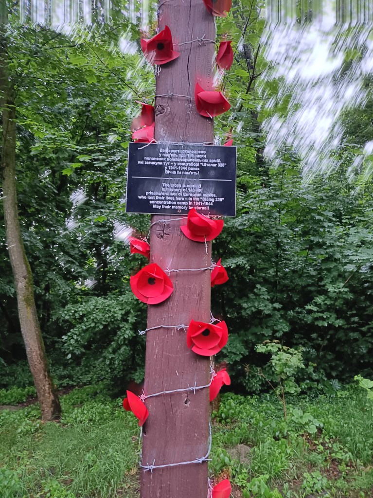 On my evening stroll on my first day in Lviv I stumble across an overgrown and unkept green space at the end of a small and winding residential street up a hill. Along my accidental path I find a 10 feet high wooden cross near semi-collapsed and overgrown one-story buildings that resemble barracks. Red poppies and barbed wire enclose the cross while burnt candles litter its base. An inscription in both Ukrainian and English tells me, that I am standing within Stalag-328 where 140,000 prisonors of war (POW) were murdered 1941-44. Nazi-Germany maintained this POW camp where the death rate among its Soviet, Belgian, French, and Italian soldiers exceeded 50%.