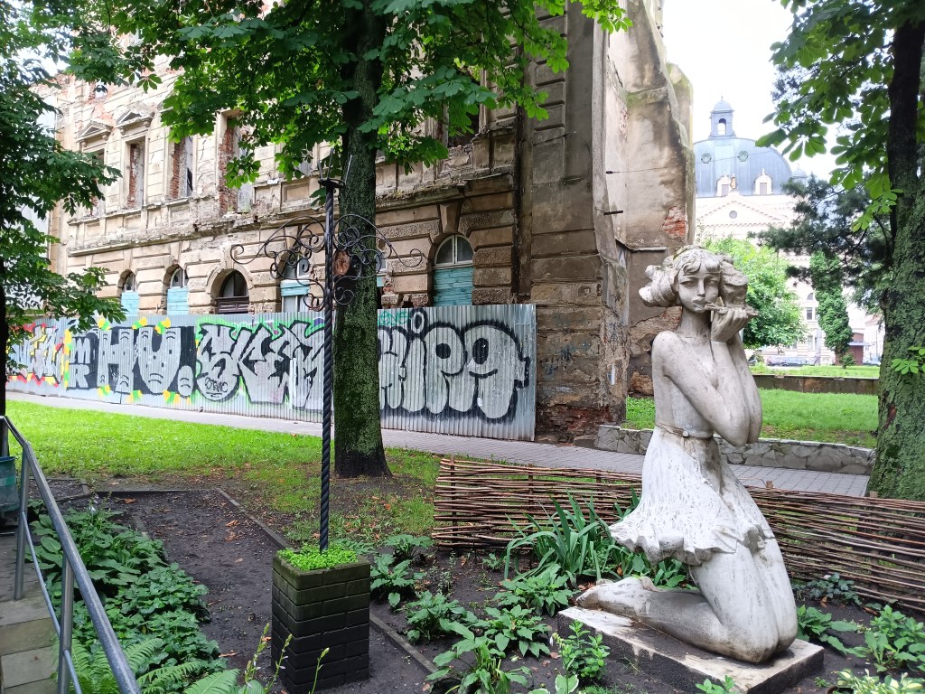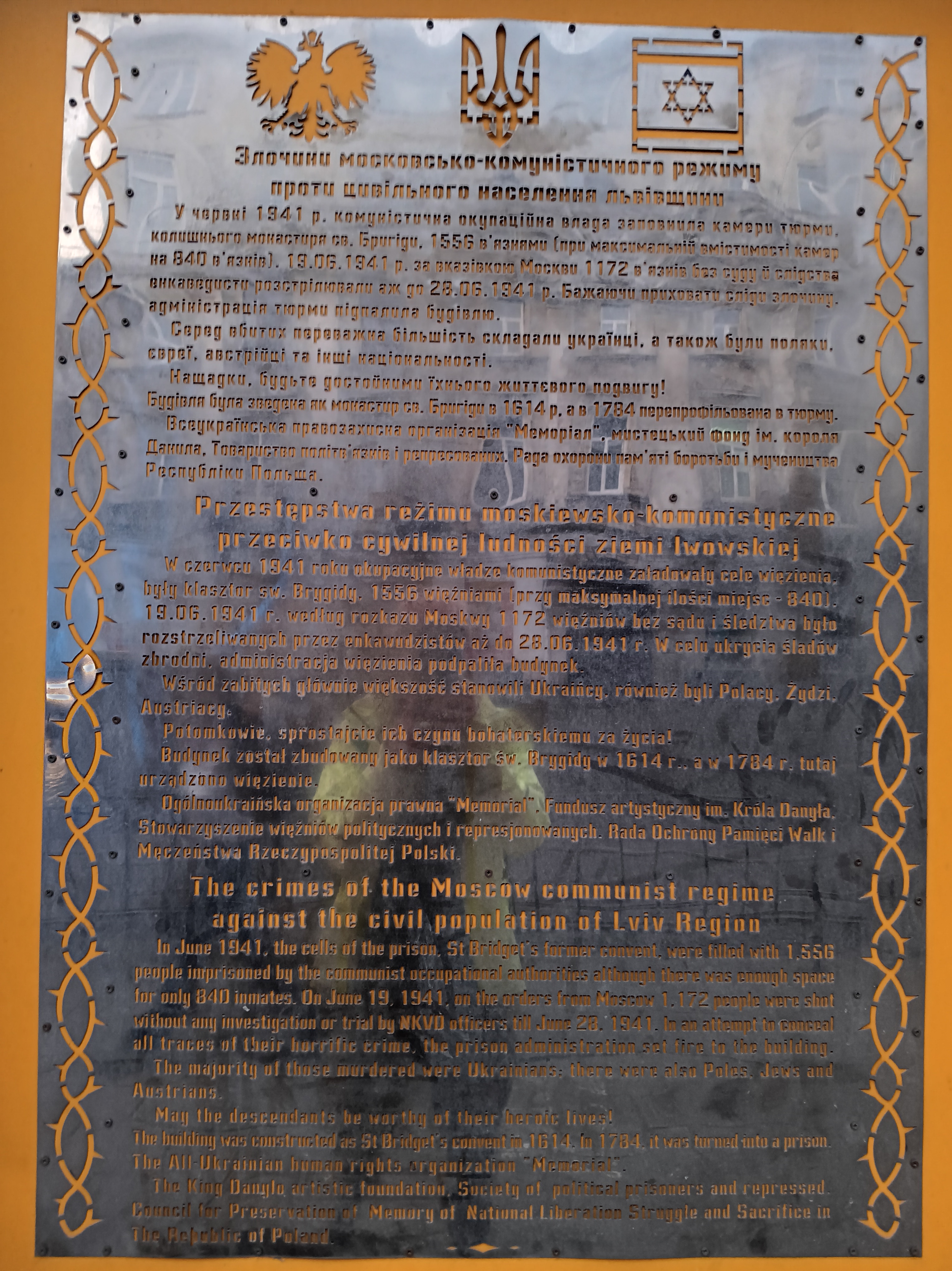 Half an hour later I find a huge 3-story building along a busy road that covers an entire city block. Later I find out, that this is the St. Bridget’s Convent for Women built in the 17th century, but it serves as a prison for the last 250 years which perhaps explains its decrepit look on Horodotska Street. On one of its walls I find a plaque in Ukrainian, Polish, and English stating that the Stalin’s Secret Police, the NKVD, shot 1,172 citizens of Lviv in this building on 19th of June 1941. This massacre at the Brygidki prison was part of a mass killing throughout Soviet occupied Poland and Ukraine.