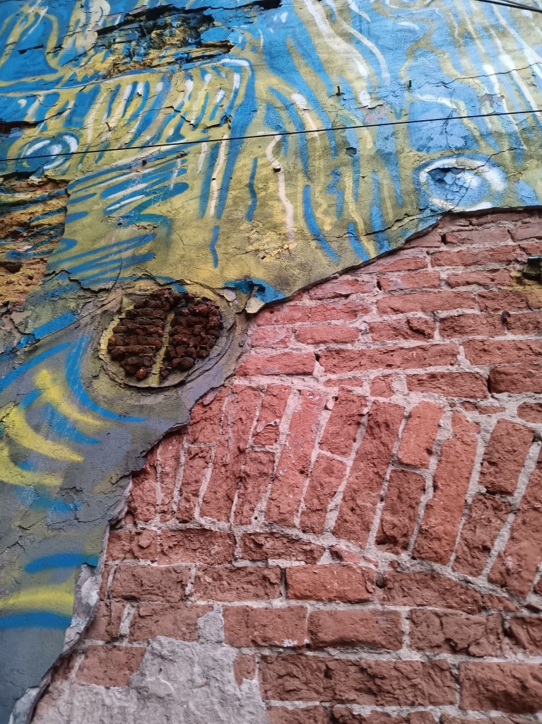 On my way home from Brygidki Prison I pass a beautiful mural that brings me back into the present. The blue and yellow of the mural reminds me of the colors of the Ukrainian flag. The braided flowers on the head perhaps symbolize this person as a women from Ukrainian. In my present sad mind, I see the the same human in both the symbol of a Ukrainian woman in this mural and the actual Ukrainian women in the 1941 photo. The paint peeling reveals red brick and an arch, but I also see an accidental thumbs-up sign in red. The mural is about two blocks west of the Opera House and thus near the center where the Lviv progroms took place.