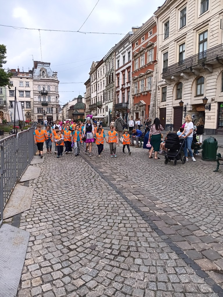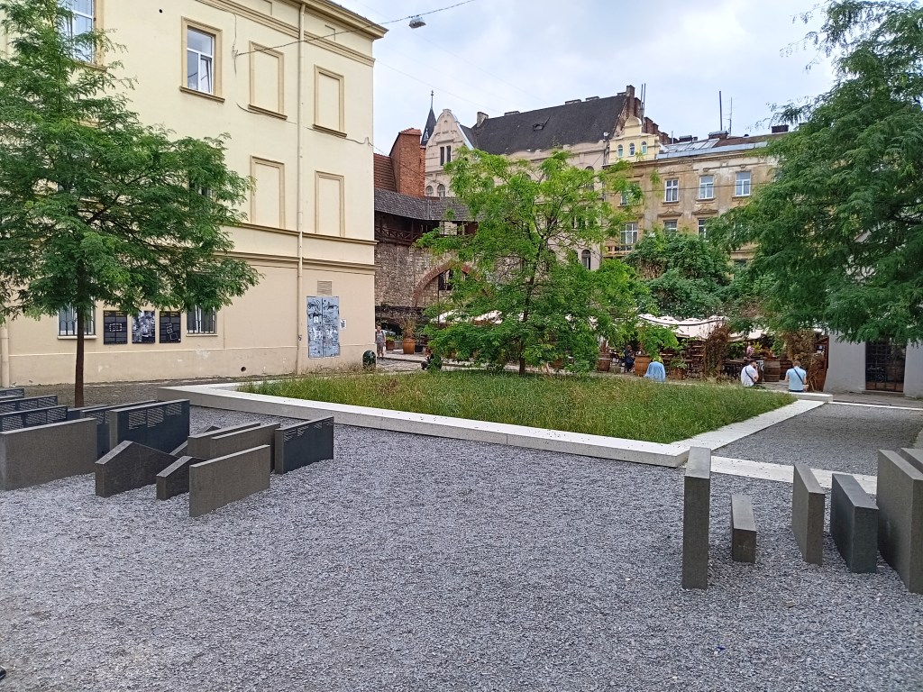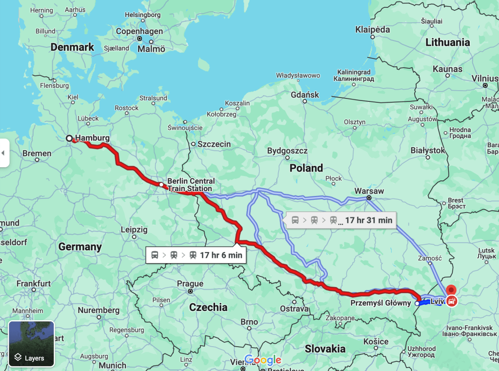 My voyage started at my parents home in Neustadt on the western edge of the Baltic Sea at 6 am. A first train got me to the old Hanseatic town of Luebeck, a second train to Hamburg, and a third train to Berlin. Here I bought the missing train ticket #5 from Przemysl in Poland to Lviv in Ukraine before boarding train #4 from Berlin to Przemysl. My reserved seat for the next 10 hours placed me opposite to a young Ukrainian artist traveling home to Kyiv. Along the way she introduced me to Lviv where she had lived in a prior life. Her pointers of Lviv places to visit, eat, and walk provided me with major initial reference points. As she had crossed the border into Ukraine many times before, we went for a evening stroll in Przemysl and found a busy beer-garden where we had a beer and gin tonic. Despite this “delay,” we still had to wait for 3 hours to be allowed on the next train that was 2 hours late. A large group of perhaps 20 Orthodox Jewish men with U.S. passports were waiting as well. I asked one of them what language they were speaking and he replied “Jiddish.” Bente Kahan’s music from her album “Farewell Cracow” was on my mind even more now than it was prior to this voyage. Once this last train left Poland just before midnight, the mood became somber.