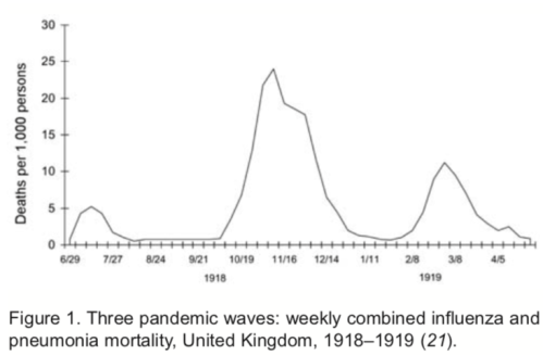 This pandemic of 100 years ago came in three distinct pulses in the spring of 1918, in the fall of 1918, and in the winter of 1919. The graph shows that during the first wave about 0.5% of all infected people died while the second and third wave were more deadly with 2.5% and 1.3% fatality rates. These rates are somewhat similar to those we see today with Covid-19, but there is much we do not yet know.