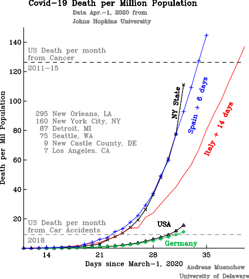 So, while Covid-19 has killed about as many people in the US the last 4 weeks as people died in car accidents, in New York State the number of Covid-19 dead is about to exceed those who died of cancer in this same period. The hardest hit place in the US, however, is not New York City (160 dead per million), but New Orleans (295 dead per million). The County or Parish of New Orleans, Louisiana has about 400,000 people or a little less than New Castle County in Delaware where I live, but New Orleans has 115 dead compared to 5 in New Castle County (9 dead per million).