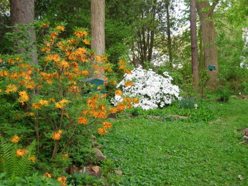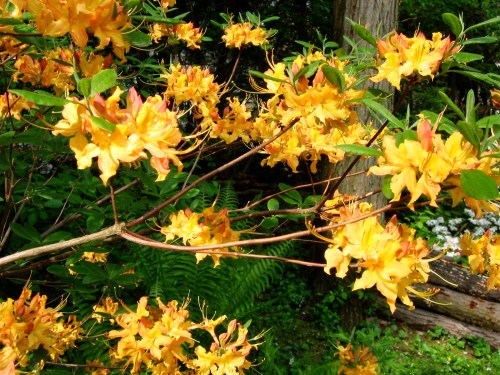 I sit in my home office looking into a garden which explodes in yellow from the forsythia with splashes of pink from the camellias. Both flourish after a large shading cherry tree fell down a few years ago. The tree stump is covered by moss and provides a natural border. My native American Flame azaleas (Rhododendron calendulaceum) now stand 8 feet tall in front after I planted them in 2001 as 3 inch sticks. They are the pride of my garden along with Piedmont, Sweet, Okonee, and Plum azaleas all purchased from Callaway Gardens in Georgia. They grow well, because I correctly predicted that the warmer climate zones of Georgia would move northward towards Delaware. Here are the azaleas in blooms in early May or four weeks from now: