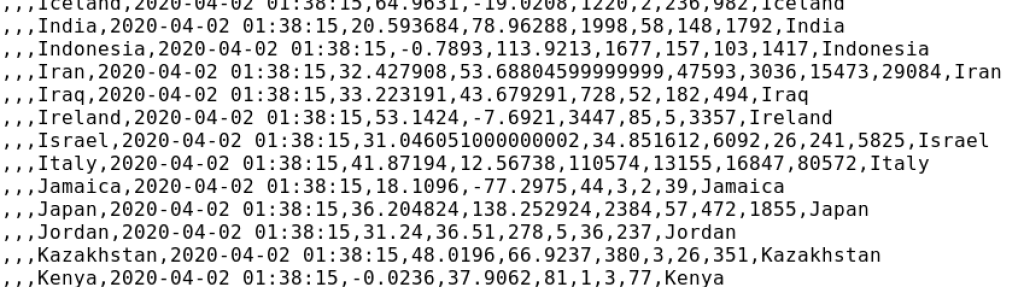 Now these are the things that I should work on during my self-quarantine, but I am obsessed and distracted with new data. The Johns Hopkins University in Baltimore, MD distributes data on the number of people who were diagnosed with Covid-19, who died of it, and who have recovered. While it is easy to access their excellent data displays as global health authorities report them, the actual raw digital data files are accessible at