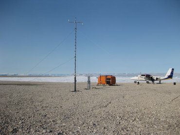 Refurbished Petermann Glacier Ocean Weather station on 28. August 2016 with Greenland Air helicopter and British Antarctic radar station in the background.