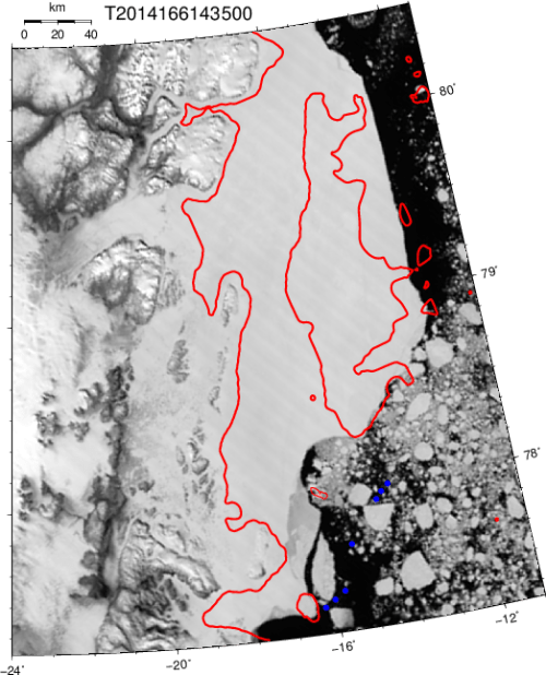 Scientists and technicians from the British Antarctic Survey drilled three holes through the floating section of Petermann Gletscher to access the ocean and ocean sediments below it. The ocean temperature and salinity profile confirmed both the warming trend observed in the fjord and ocean adjacent to the glacier, but more importantly, we placed ocean sensors below the glacier ice to measure temperature and salinity every hour for as long as the sensors, cables, and satellite data transmission would work. This has never been done around Greenland, so our data would be the first to report in real time on ocean properties below 100 to 300 m thick glacier ice at all times. What we saw when the data started to come in after 2 weeks, a month, and half a year stunned us, because (a) the ocean waters under the glacier changed by a very large amount every two weeks. Nobody has ever seen such regular and large changes in tempertures (and salinity) under a glacier bathed in total darkness at air temperatures of -40 degrees Celsius and Fahrenheit, but then our station went offline after 6 months and did not report any data to us via satellite.