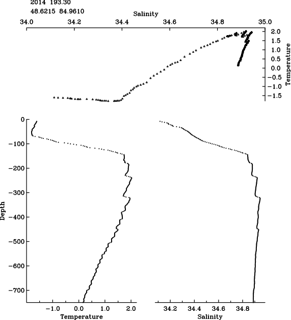 The two bottom panels show how temperature (left) and salinity (right) change with depth (or pressure). Notice that the coldest water near freezing temperature of -1.8 degrees Celsius (29 Fahrenheit) occurs between 30-m and 200-m depth (30 to 200 dbar in pressure). Below this depth the ocean water actually becomes warmer to a depth of about 500-600 m to then become cooler again. The effects of pressure on temperature are removed, this is why I call this potential temperature and label it “Pot. Temp.” The warmest waters at 600-m depth are also the most salty (about 34.5 grams of salt per 1000 grams of water). This saltiness makes this water heavier and denser than the colder waters above. This is a common feature that one finds almost anywhere in polar regions. The top panel shows the same data without reference to depth (or pressure), but contours of density show how this property changes with temperature and salinity. It takes a little mental gymnastic to “see” how density always increases as pressure increases, but the main thing here is that both salinity and temperature can change the density of seawater.