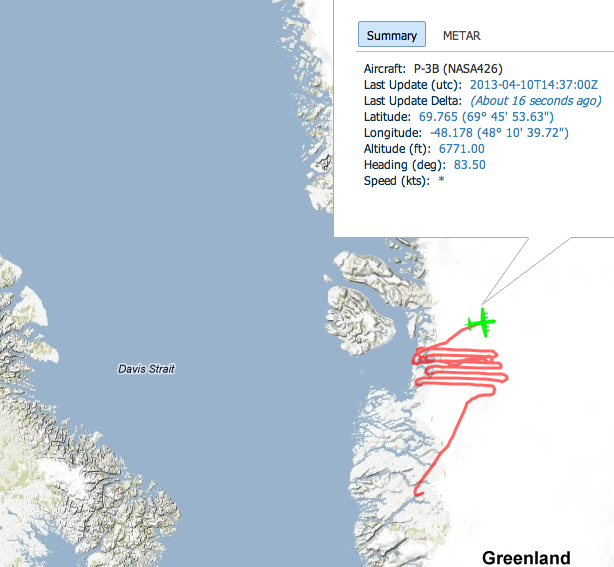 Locations of NASA’s P3 air plane near Jacobshavn Isbrae on April-10, 2013.