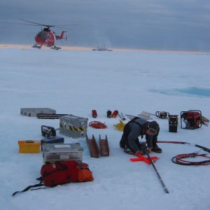 Dr. Michelle Johnston assembling ice drilling gear in Nares Strait with Greenland on the horizon. The Canadian Coast Guard Ship Henry Larsen in the background with its helicopter hovering.