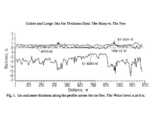 She measures temperatures within the ice and tries to crush it to find out how strong it is. All of this information guides ship operators on what dangers they face operating in icy seas. Drilling over 250 such holes across a small floe on the other (eastern) side of Greenland, Dr. Hajo Eicken showed how one large ice floe changes from less 1 meter to more than 5 meters in thickness. He also discovered that the percentage of thick and thin ice of his single 1 mile wide ice chunk is similar to the percentages measured by a submarine along a track longer than 1000 miles.