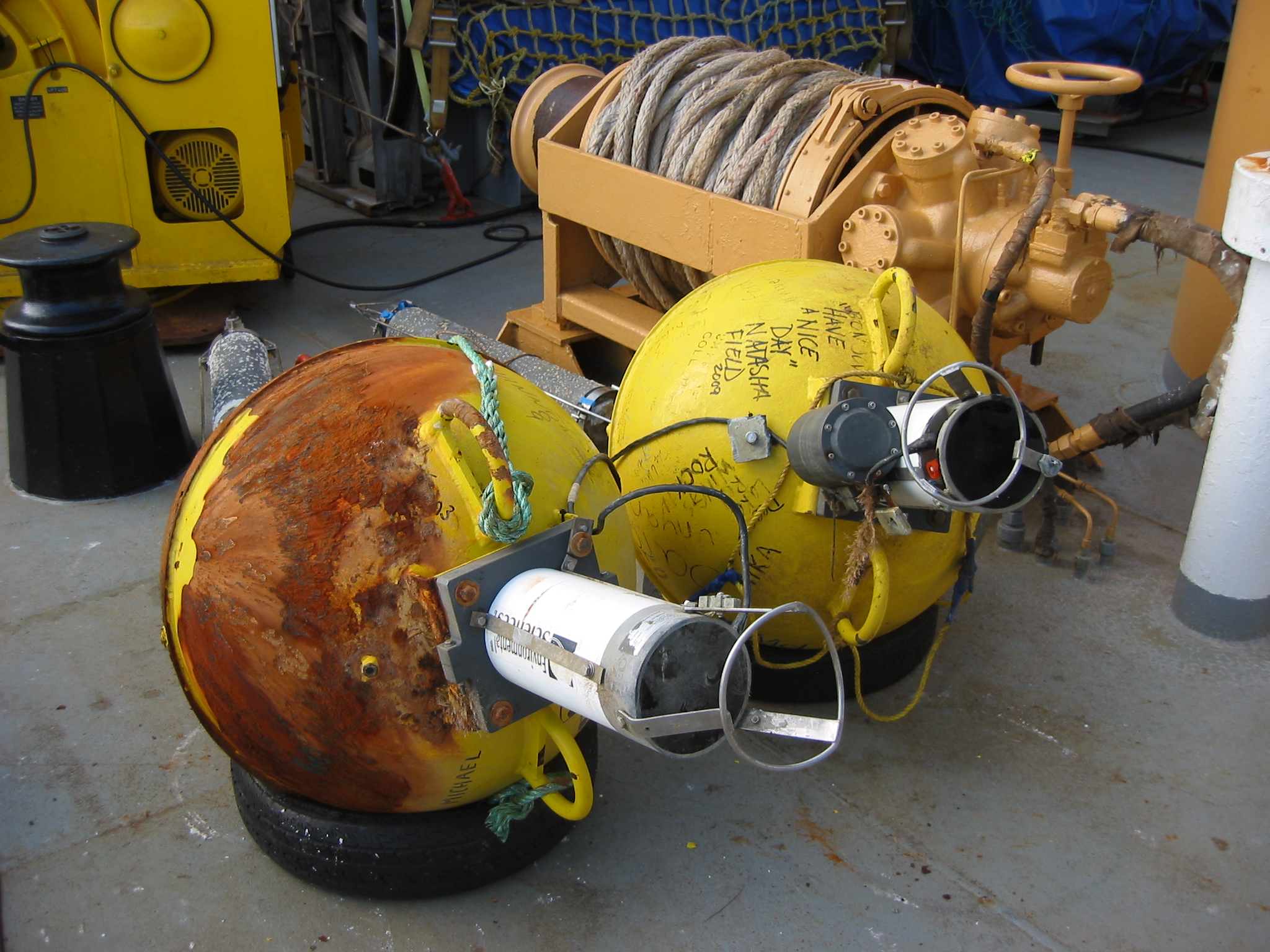 Two Ice Profiling Sonars (IPS) aboard the CCGS Henry Larsen in Aug.-2012. The bent stainless steel protective frame was bent by the 2010 ice island that hit both instruments in Sept.-2010. [Photo Credit: Andreas Muenchow]