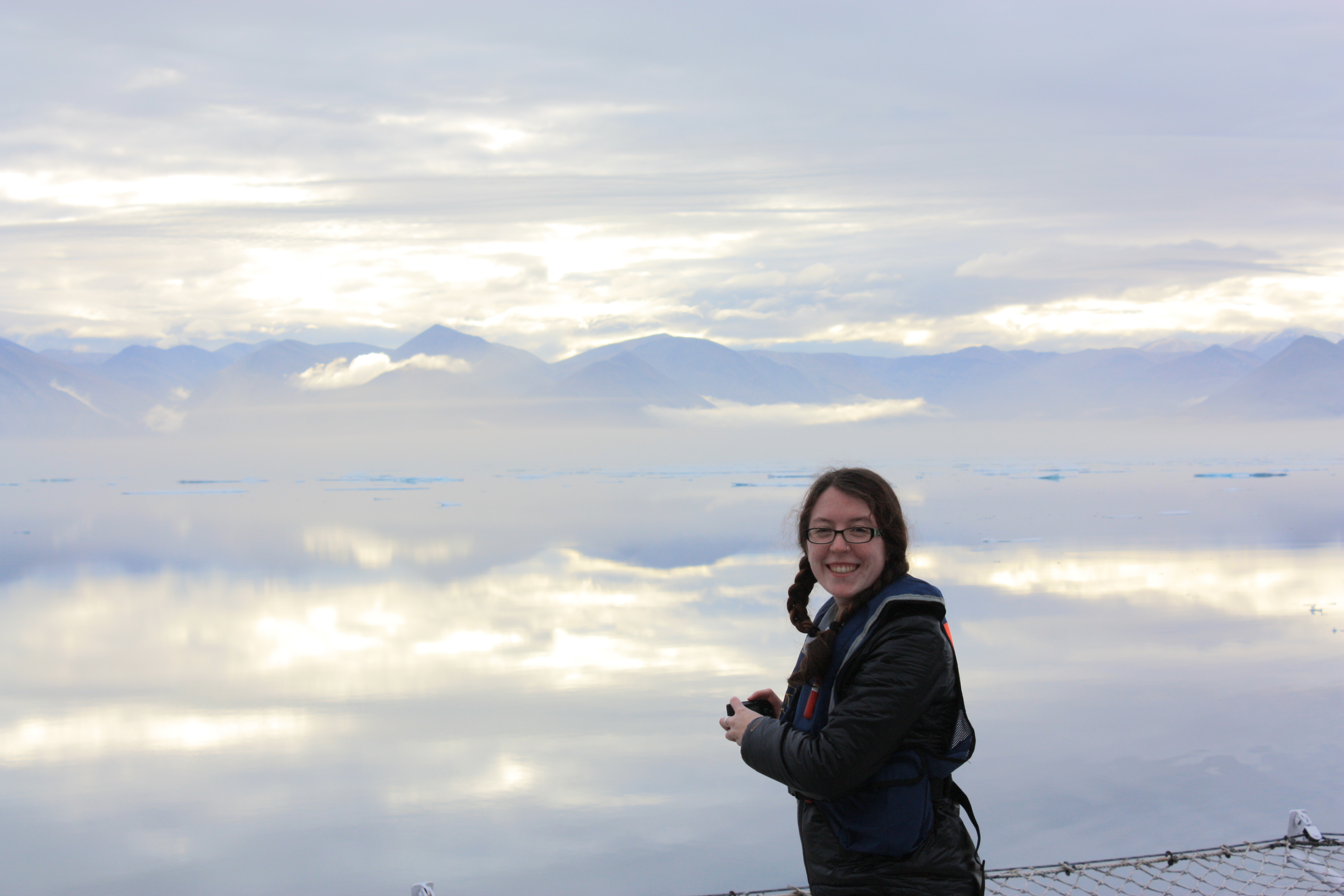 University of Delaware summer intern Allison Einolf from Macalester College, Minnesota in Nares Strait in Aug.-2012 aboard CCGS Henry Larsen. Allison studies physics. [Photo Credit: Jo Poole, British Columbia]