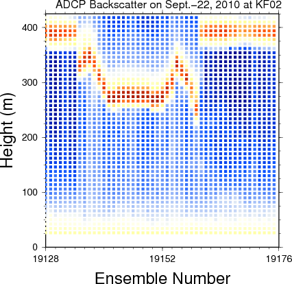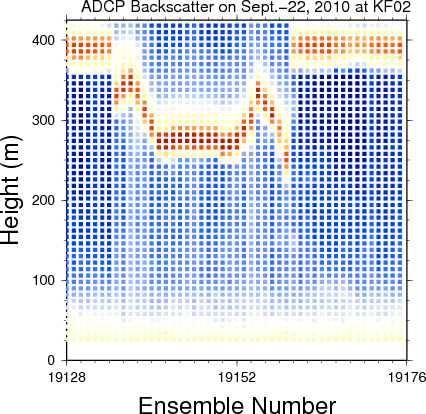 A 24-hour segment of acoustic backscatter from a bottom-mounted acoustic Doppler current profiler is show to vary with time and height above the bottom. The dark red represents the sea surface and/or the bottom of ice floating on it. Vertical resolution is 8 meters, temporal resolution is 30 minutes for a 3-year deployment. The main purpose of this instrument is to measure ocean currents at the same spatial and temporal resolution as shown here for backscatter. PII-2012-B passed over the instrument on Sept.-22, 2010 and is here estimated to be about 144 meters thick.