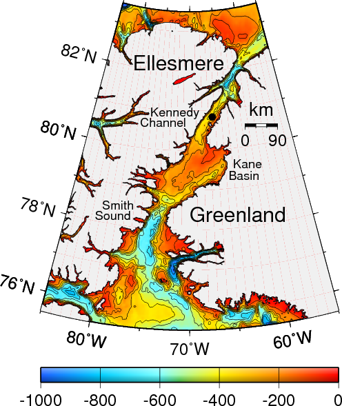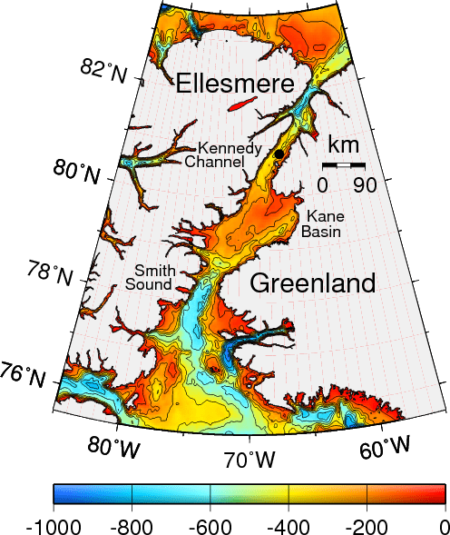 He also instigated the latest round of exchanges among “Friends of Nares Strait” about the fate of the ice island that broke off earlier this summer from Petermann Gletscher. He asked yesterday what may happen if PII-2012 reaches the sill separating northern Nares Strait and the Arctic Ocean from southern Nares Strait and the Atlantic Ocean. This sill is the deepest connection between the Arctic Ocean to the north and Baffin Bay in the south. The sill is in western Kane Basin off Ellesmere island and is about 220 meters deep.