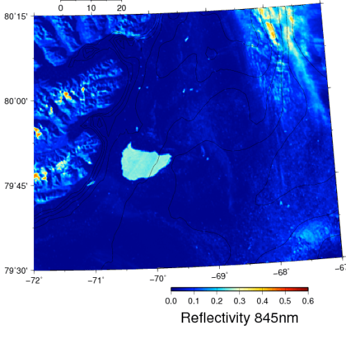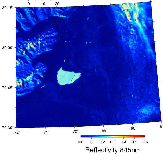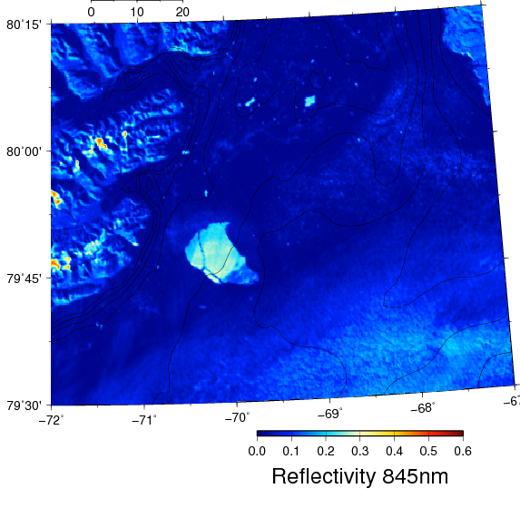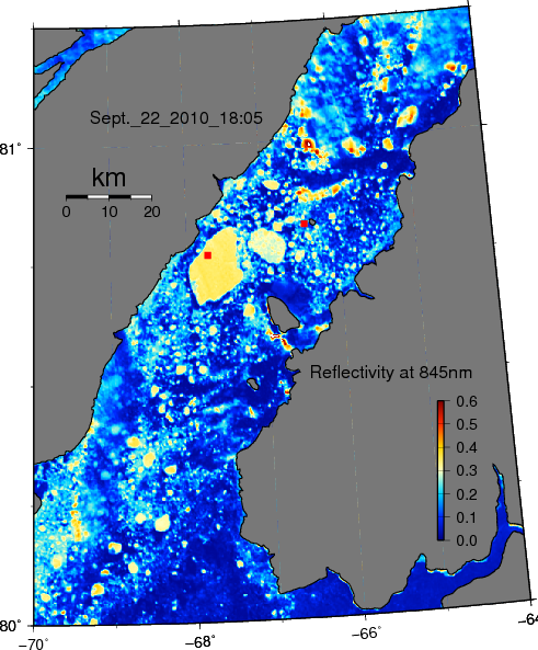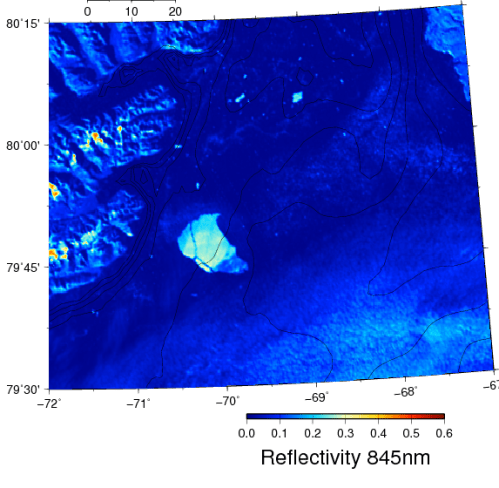 Petermann Ice Island 2012 as one piece on Aug.-30, 2012 19:20 UTC in Kane Basin over contours of bottom topography.