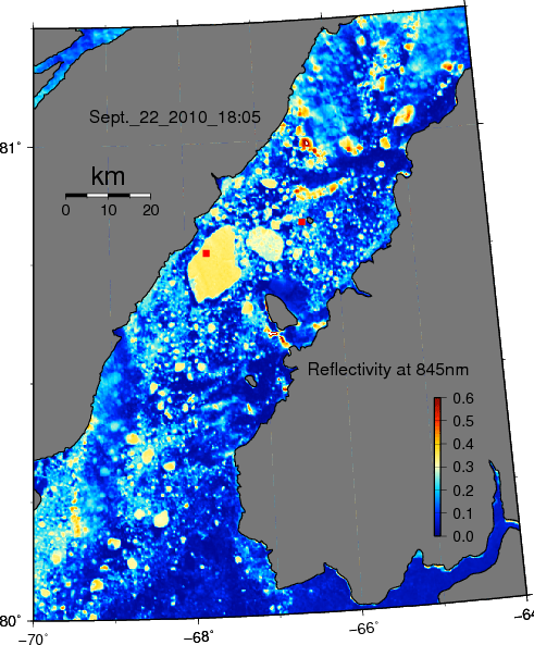 So, to answer that question one needs to know three things: Where is the ice island, how deep is the water where it is, and how thick is the ice island. Before I could assemble these three things, however, the ice island has already broken into at least three pieces. Luc Desjardins of the Canadian Ice Service answered first by pointing this out. He has access to the commercial RadarSat data that few others have. So, here is the latest from MODIS which answers the first two questions: