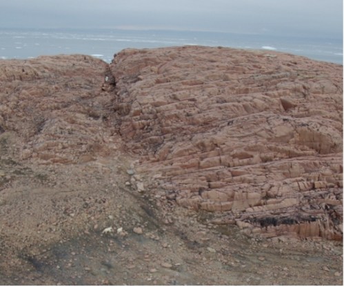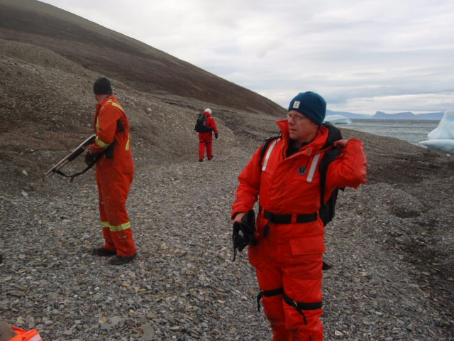 Landing party at Cape Baird, Ellesmere Island to dismantle a weather station. Scientists David Riedel (foreground) and Humfrey Melling (background) are protected by Melvin Cobb (with gun) from polar bears. View is towards the north-west across Lady Franklin Bay to the west of Nares Strait. [Photo Credit: Renske Gelderloos, Oxford University]