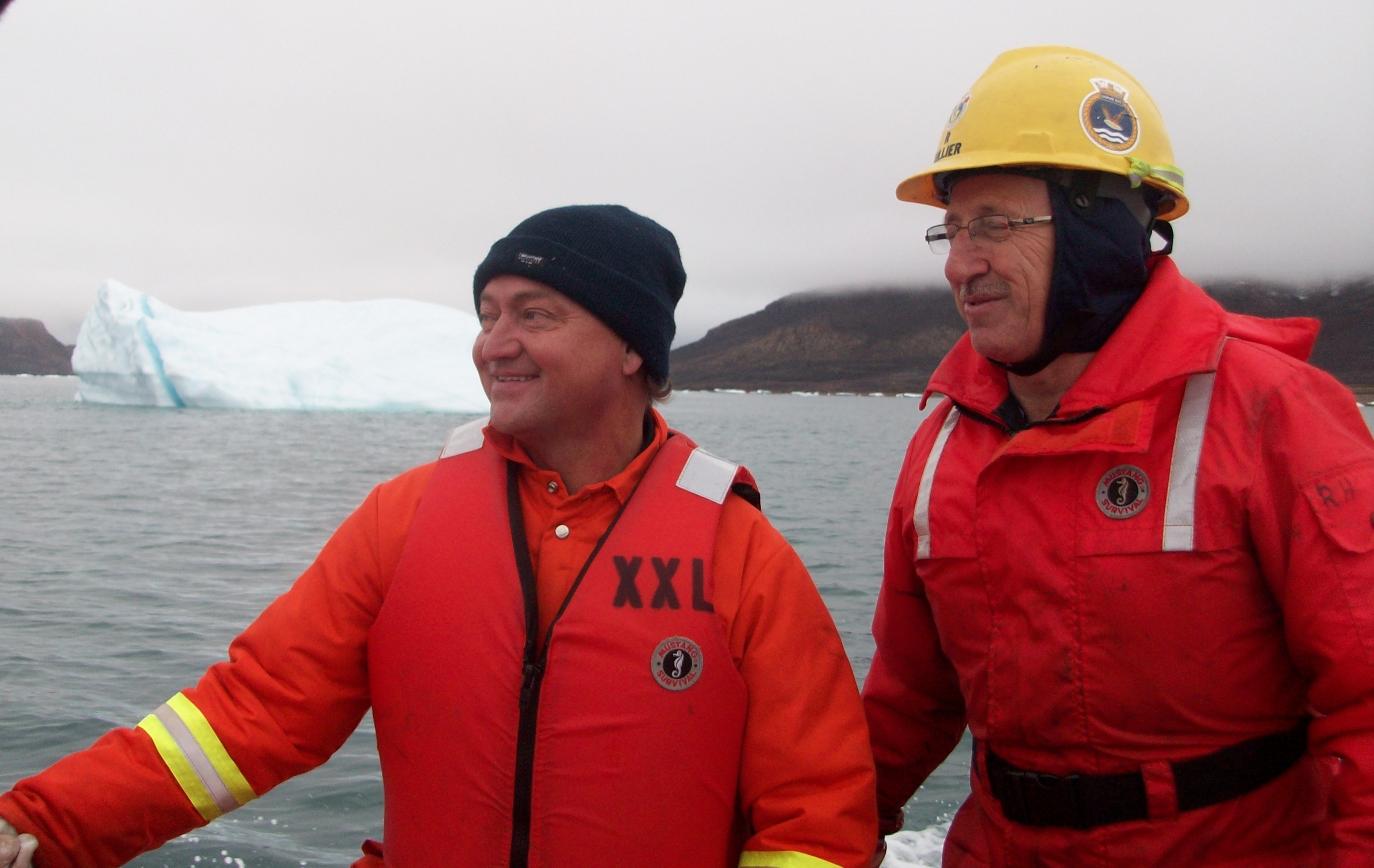 Helicopter pilot Don Dobbin with scientist Dave Riedel on Hans Island servicing a weather station in the center of Nares Strait. Ellesmere Island in the background. [Photo Credit: Allison Einolf, Minnesota]
