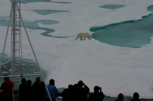 Polar bear on an ice floe in Kennedy Channel as seen from the bridge as the ship was approaching a station a day’s polar bear walk from Cape Baird. [Photo Credit: Canadian Coast Guard Ship Henry Larsen]
