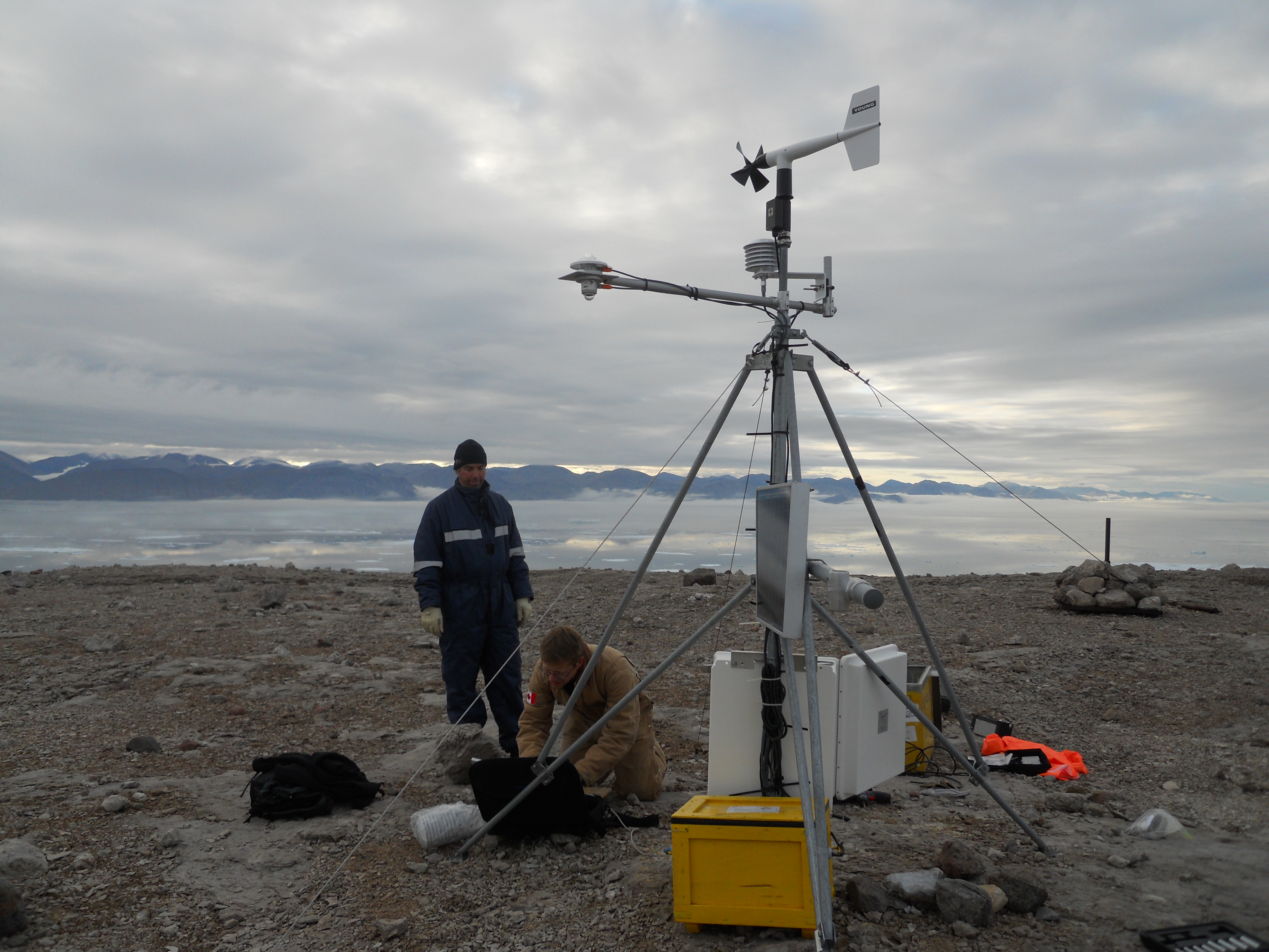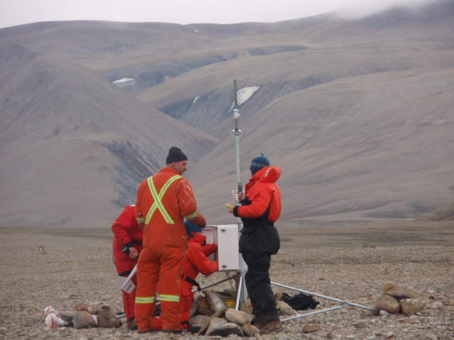 Taking down a weather station on Cape Baird, Ellesmere Island, view is to the south-west. People from right to left, the author, David Riedel (kneeling), Melvin Cobb, and Humfrey Melling (covered). [Photo Credit: Renske Gelderloos, Oxford University]