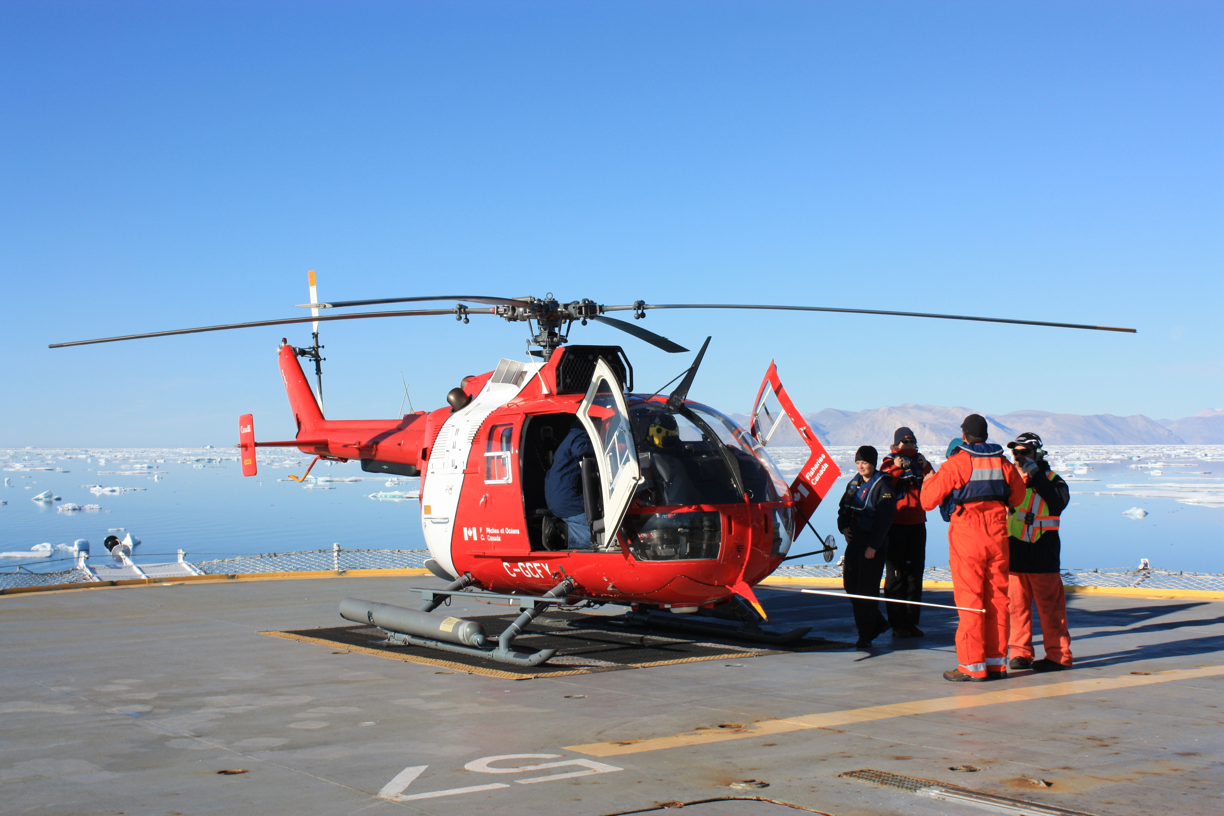 Landing deck of the CCGS Henry Larsen with aircraft preparing for take-off to survey the ice conditions ahead. Shown are Chief Officer Brian Legge (far right) who is in command of the airport and is talking to Pilot Don Dobbin (2nd from right), scientist Renske Gelderloos (3rd from right), Ice Services Specialist Erin Clarke (4th from right), and Helicopter Engineer Pierre Autran performs last checks inside the helicopter. [Photo Credit: Canadian Coast Guard Ship Henry Larsen]