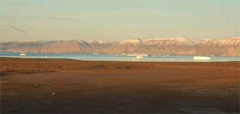 Thule AFB with its airport, pier, and ice-covered ocean in the summer. The island is Saunders Island. The ship is most likely the CCGS Henry Larsen in 2007. [Credit: Unknown]