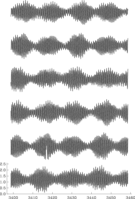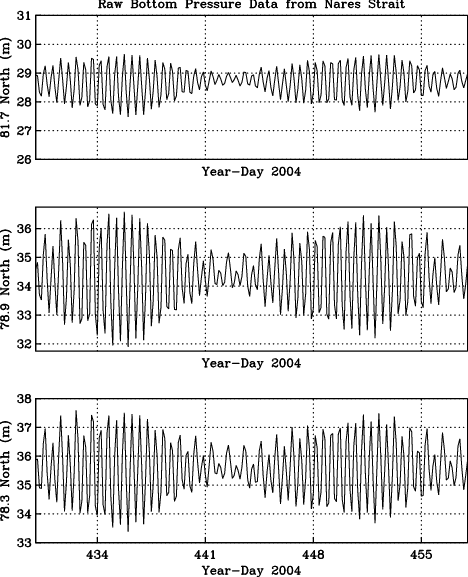 More specifically, at GZ+26 we find the ice shelf to move up and down almost 2 meters roughly twice each day. This is the dominant semi-diurnal M2 tide which has a period of 12.42 hours. Notice that for each day there is also a diurnal inequality in this oscillation, that is, the two maximal (minimal) elevations oscillate from a higher to a lower High (Low) water. This is the diurnal K1 tide which has a period of 23.93 hours. And finally, all amplitudes appear modulated by some longer period that appears close to the record length of almost two weeks. This is the spring-neap cycle that is caused by a second semi-diurnal S2 tide that has a period of 12.00 hours. A formal harmonic analysis to estimate the amplitude and phases of sinusoidal oscillations at M2, K1, S2 and many more tidal constituents will be published elsewhere for both Petermann Fjord and Nares Strait. Preliminary results (not shown) reveal that the amplitudes and phases of the tidal signals at GZ+26 are identical to those observed off Ellesmere Island at 81.7 N latitude in both the 19th (Greely, 1888) and 21st century.