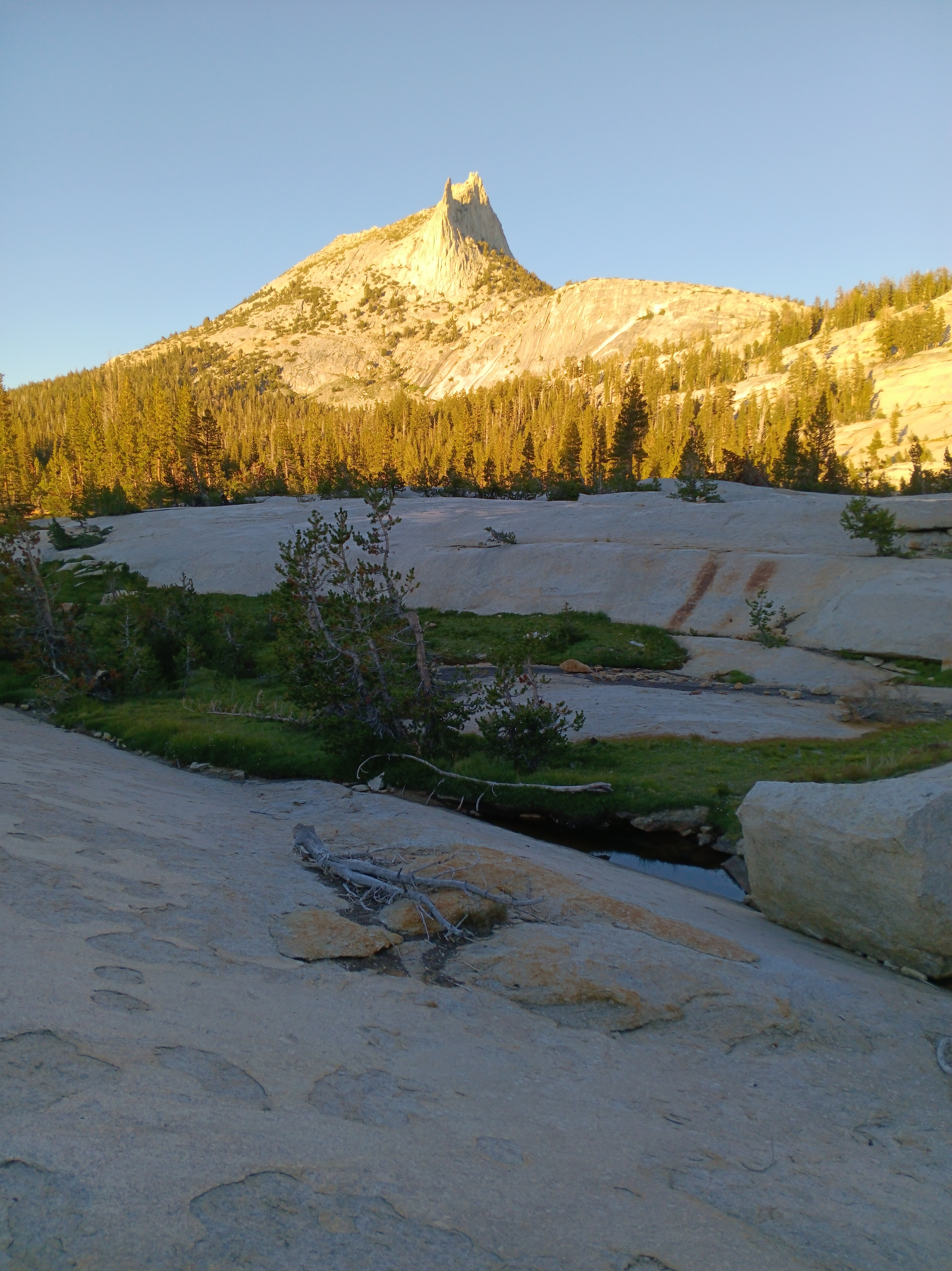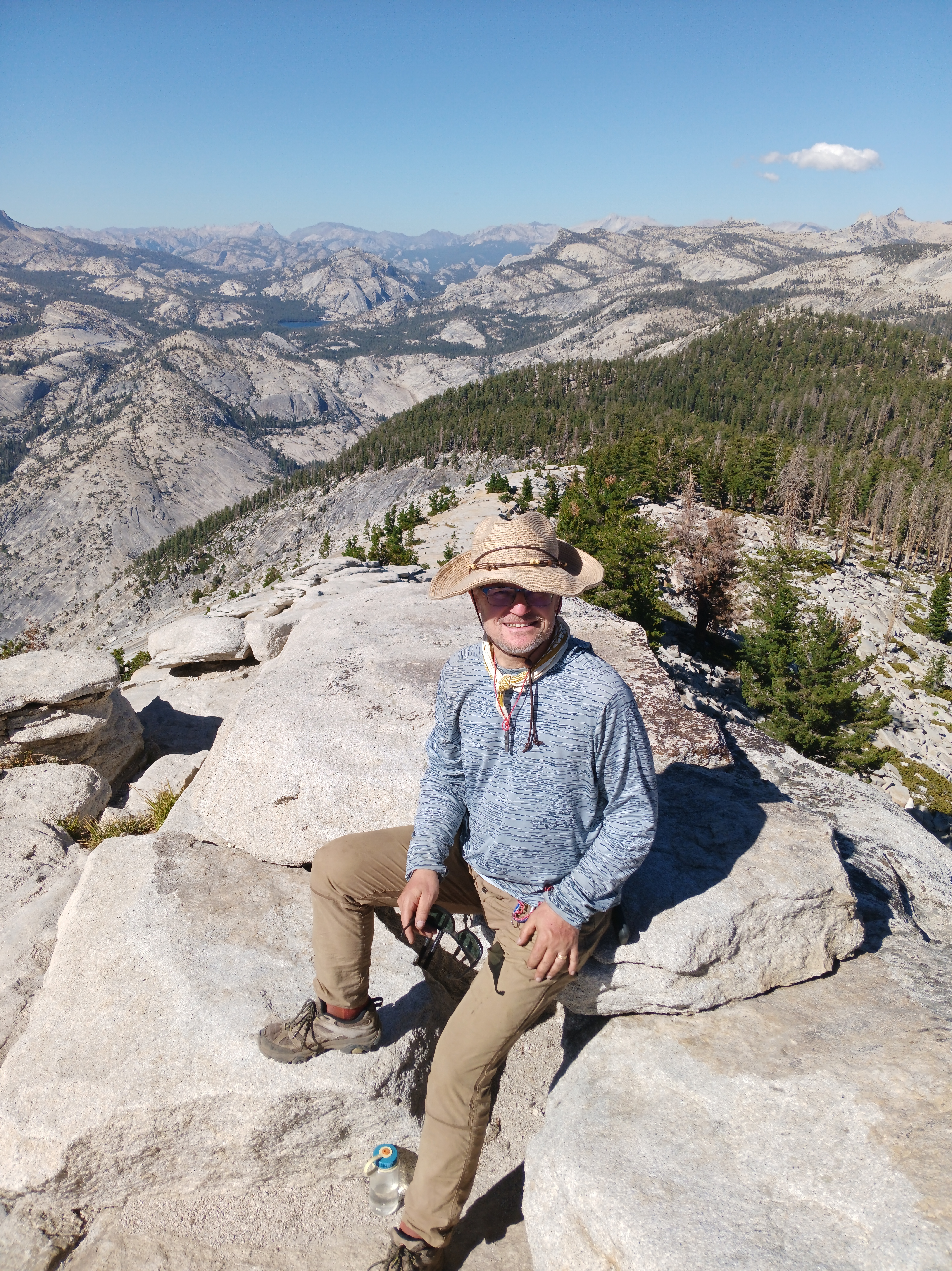 The return loop through Yosemite added 82 miles, but these 82 miles required a different set of physical and mental skills, because away from the JMT both people and trails disappear intermittently for days which does not happen on the JMT. The gallery below shows my camp #9 above Half Dome (top left), myself on Clouds Rest (top center), and Cathedral Mountain seen from Lower Cathedral Lake (top right) either on or near the JMT. The larger bottom photo shows the Clarke Range in the distance that I crossed 5 days later. I took the photo above Clouds Rest before descending to Yosemite Village the next day.