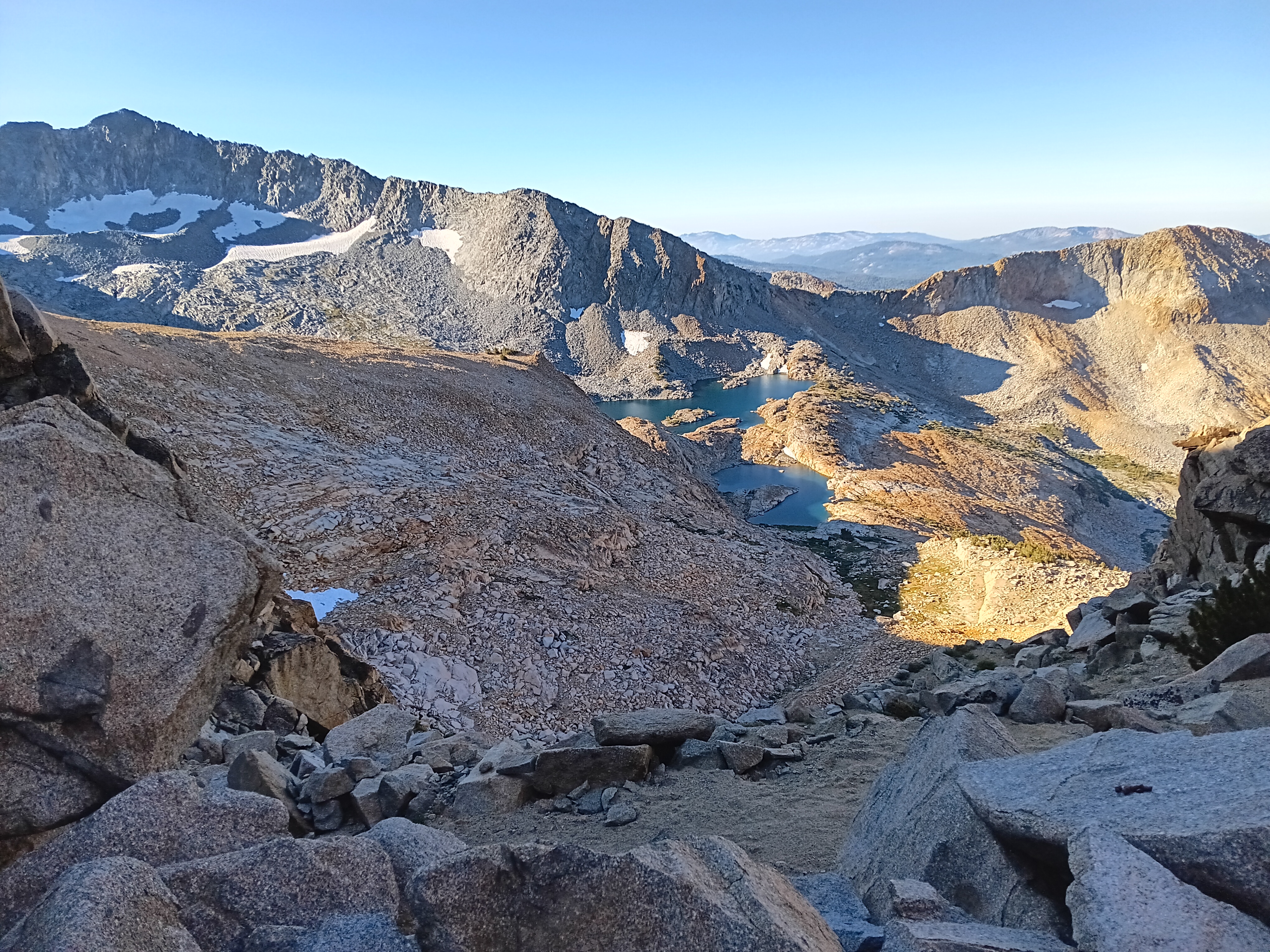 The next two days I only met one group of 2 hikers on my way to Merced Pass Lakes (camp #12) and nobody to Ottoway Lakes just below Red Peak Pass in the Clarke Range. My campsite #13 in the top-left photo below is the small flat area in the shade next to a 20 feet high block of granite. My view towards the west included Merced Peak at 11,726 feet (3574 m) and nearby patches of snow.