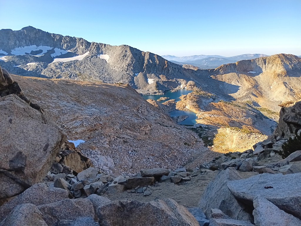 Iceberg Lake in the fore and Minarets in the back. The view is from north to south. Cecile Lake is above the dam or step ledge on the left. The photo was taken in 2011, but the snow and ice fields were not that different when I limped down with a swollen ankle on Aug.-11, 2024.