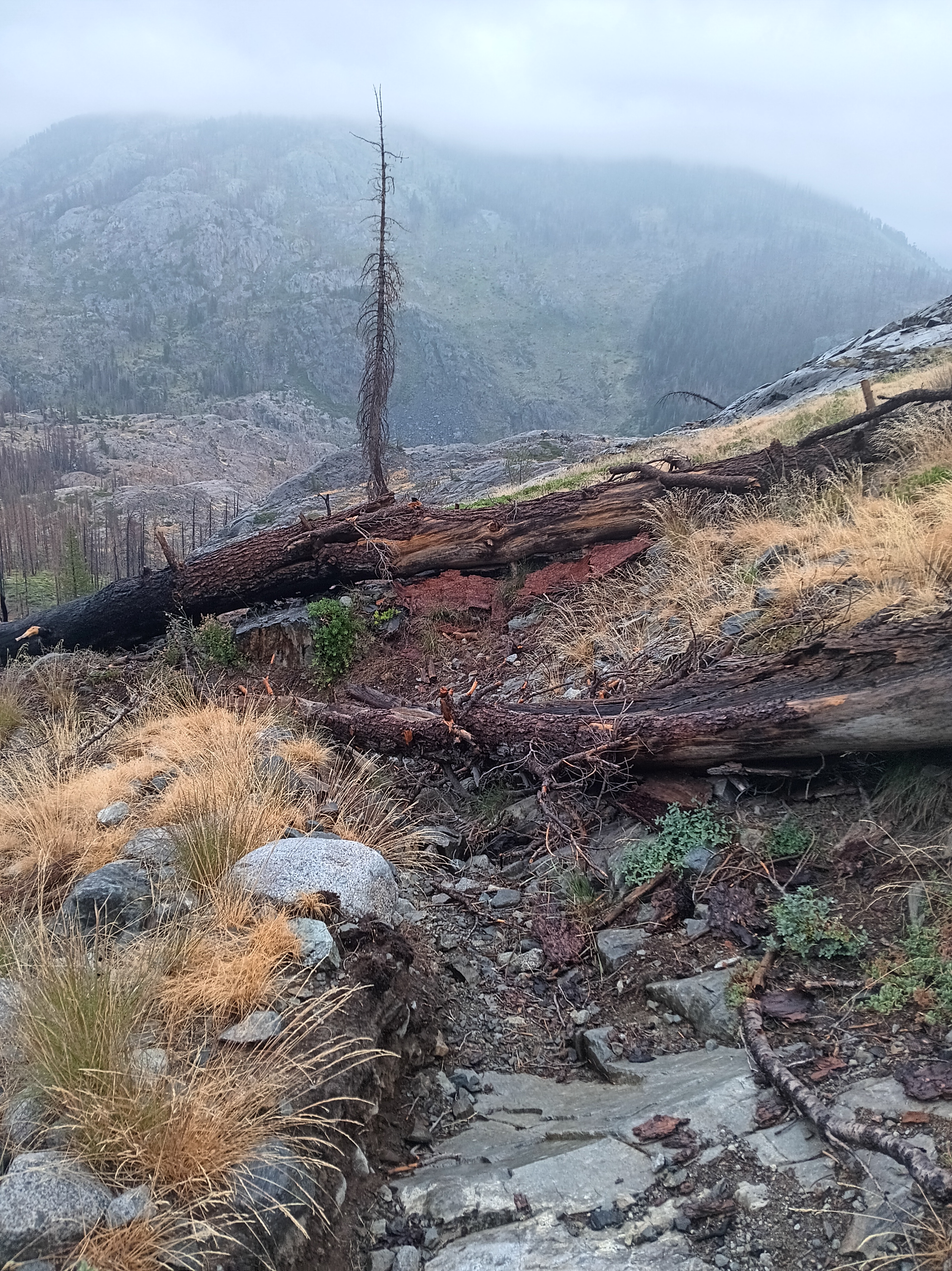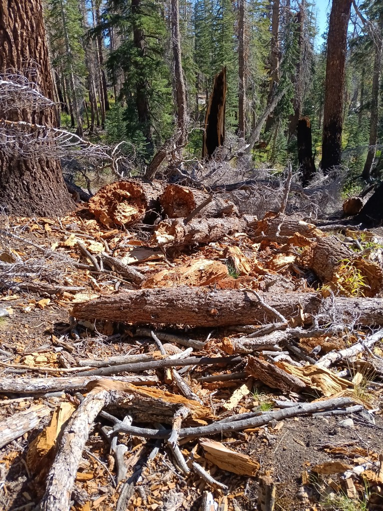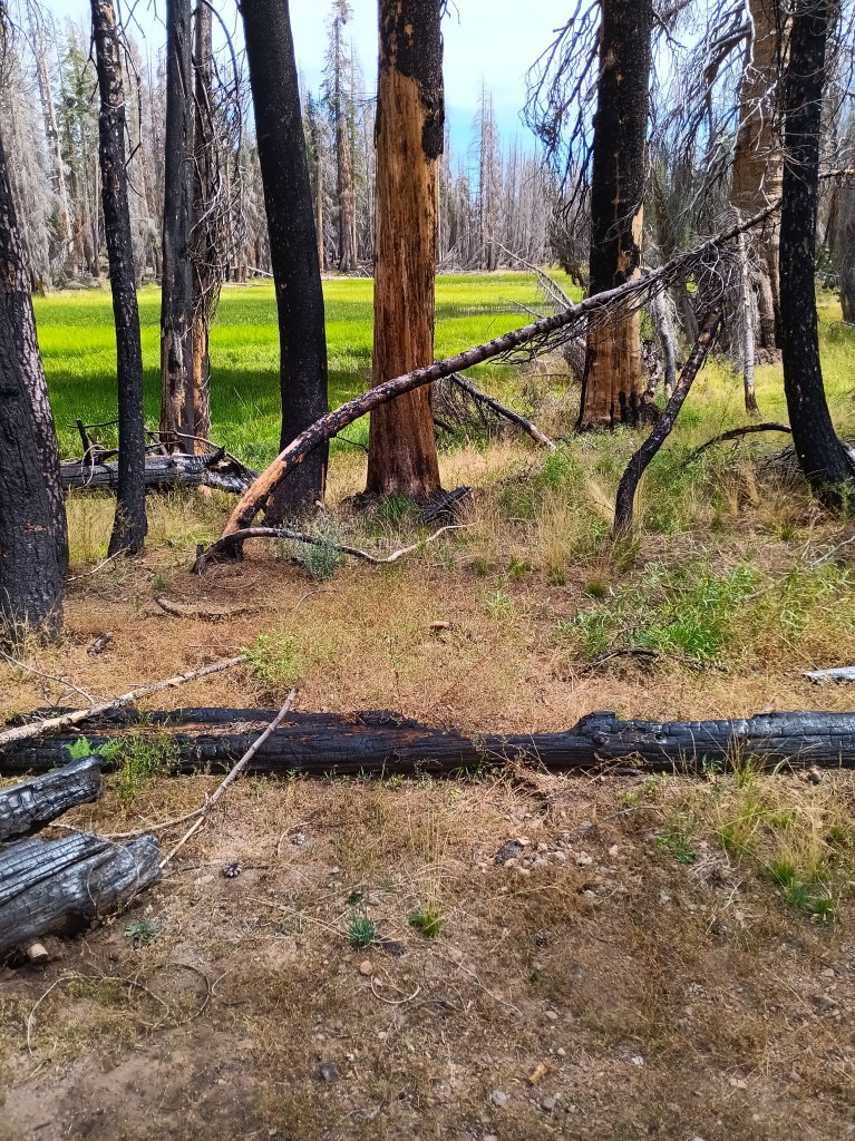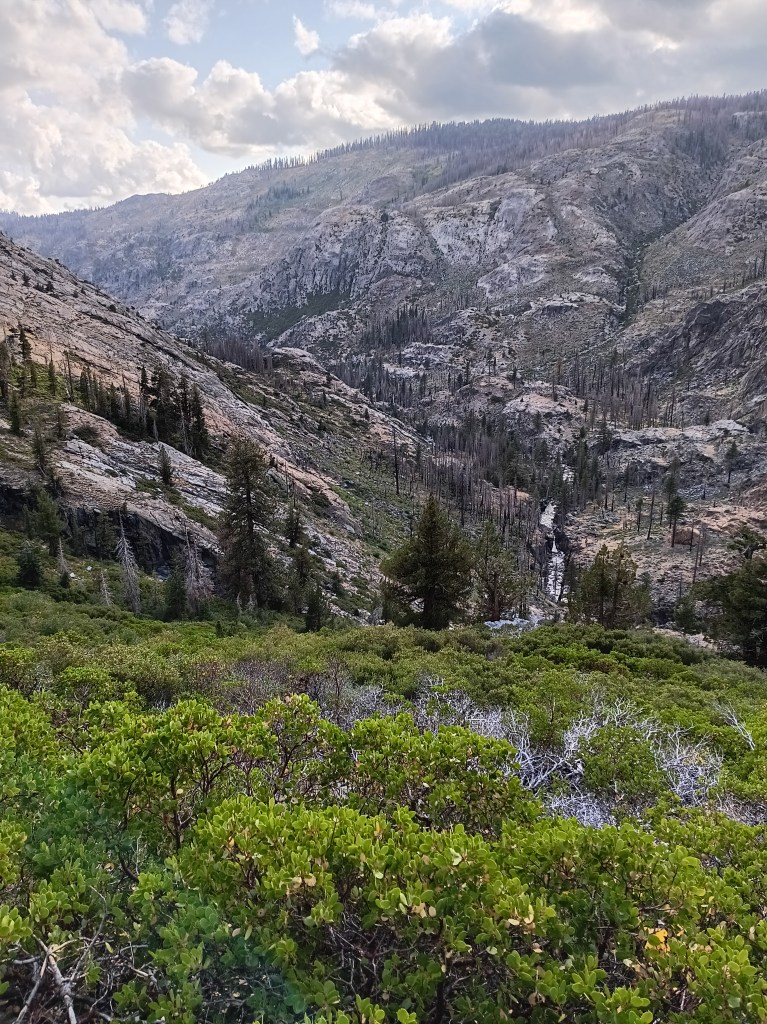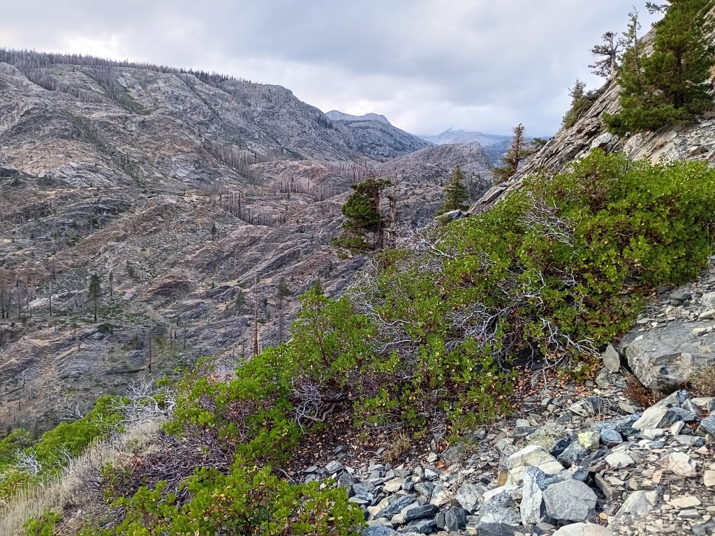All the above photos are on and along this disappeared “maintained” trail where most trees had burnt in many prior forest fires, the steel bridge over the San Joaquin River at Hemlock Crossing had washed out 2022, and snow, rain, and sleet drenched me. Not the best conditions to navigate by map, compass, and GPS altitude through chest-high, wet brush. Wilderness.