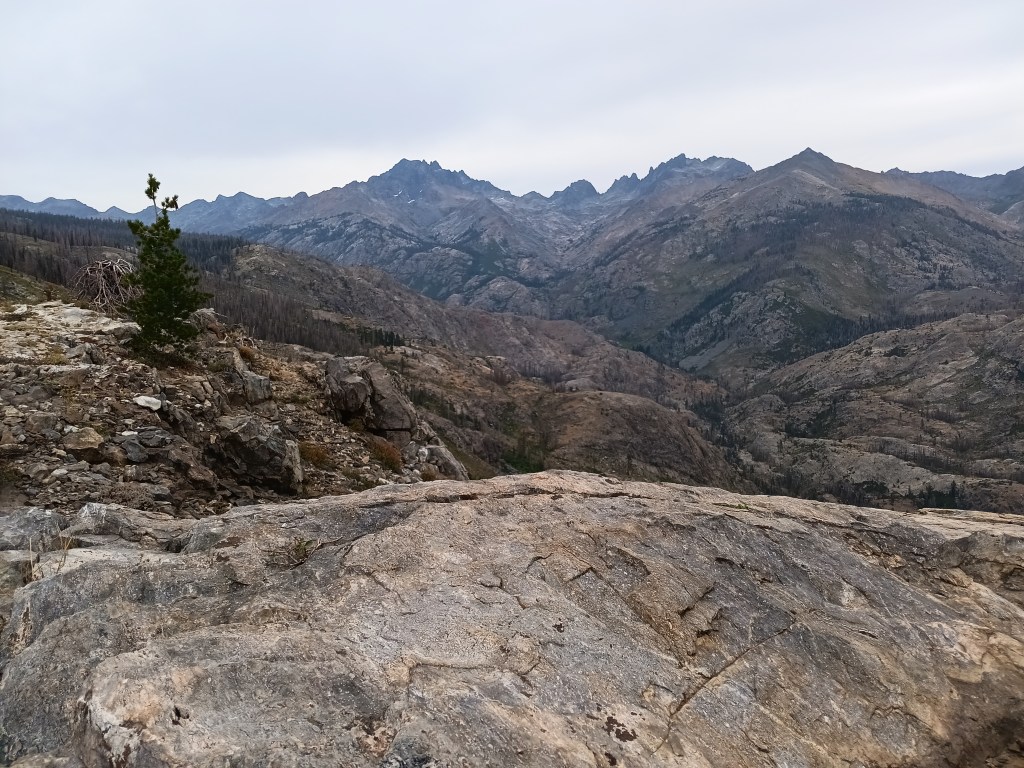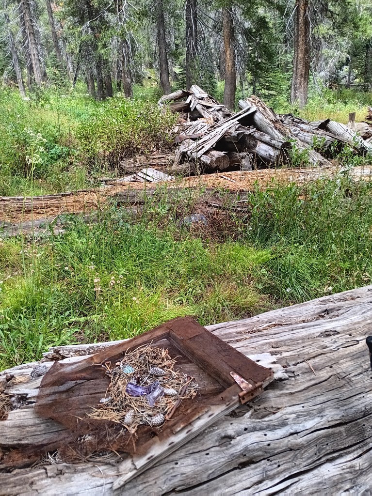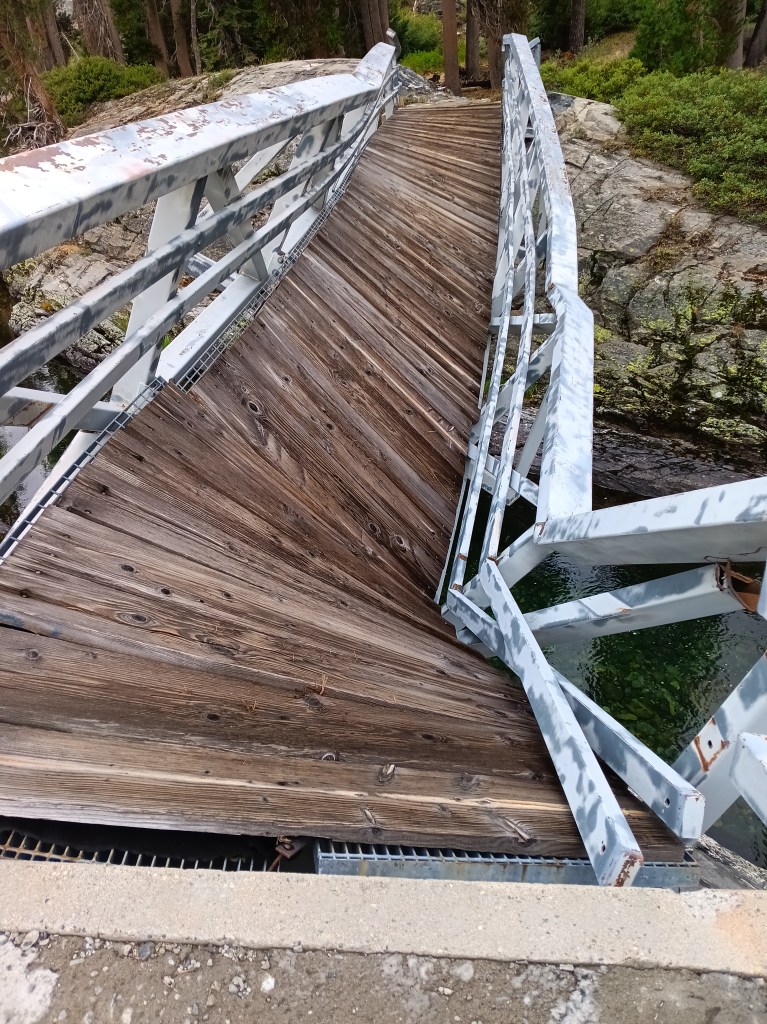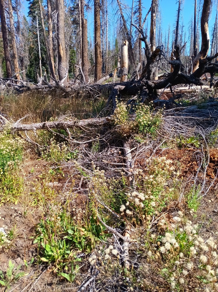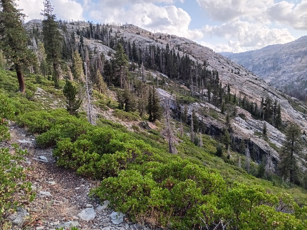 All the above photos are on and along this disappeared “maintained” trail where most trees had burnt in many prior forest fires, the steel bridge over the San Joaquin River at Hemlock Crossing had washed out 2022, and snow, rain, and sleet drenched me. Not the best conditions to navigate by map, compass, and GPS altitude through chest-high, wet brush. Wilderness.