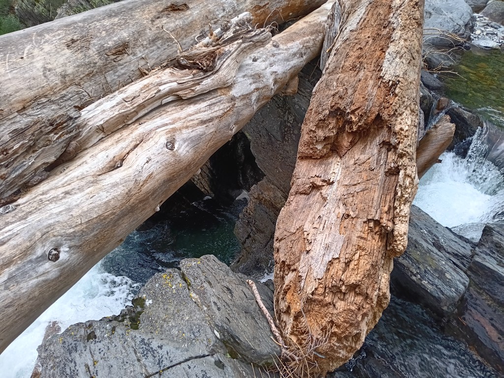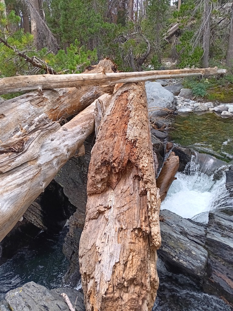 Wet, hungry, and discouraged I reached Hemlock Crossing at noon on Aug.-24, 2024 and discovered its badly damaged bridge. What to do? Rest, eat, and dry out before deciding. Feeling refreshed after a large, warm, hour-long lunch and dry clothes, I decided that the twisted bridge was unsafe to use, but that several logs downstream perhaps offered a better way across the swollen river. Strapping my backpack very tightly to my shoulders, I slid on all fours onto and along two large logs hugging them tightly. A climb over a smaller log lodged across the two larger logs was an added challenge (see photo below top left). This “bridge” was above a 20 feet waterfall downstream and a deep pool of water on the upstream side. I cried on the other side happy to be alive.