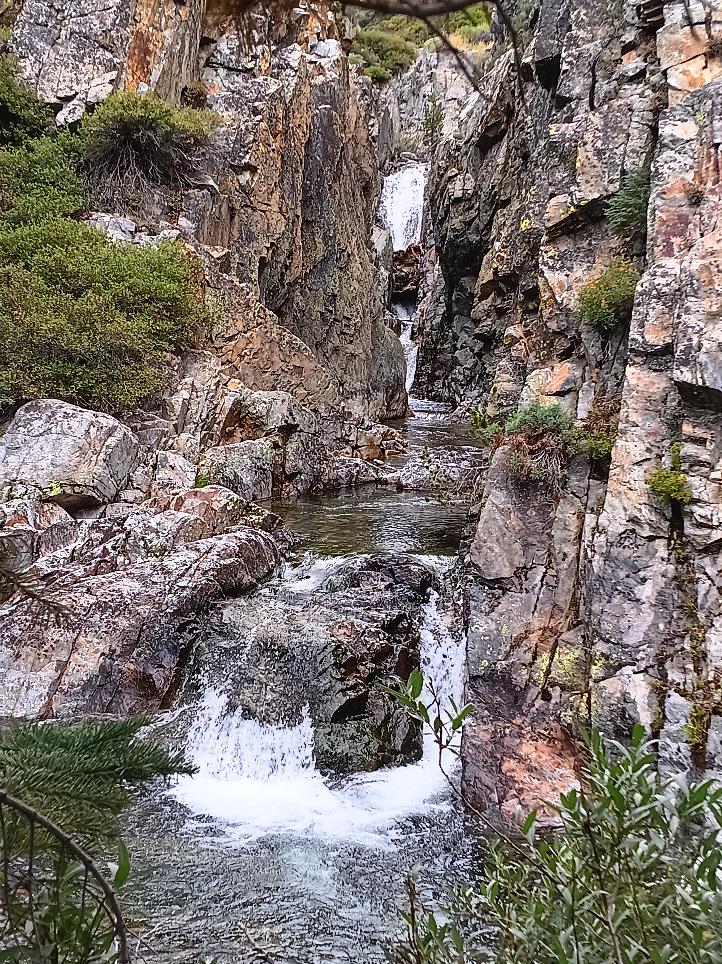 My old Tom Harrison paper map of Ansel Adams Wilderness showed a “maintained trail” for the next 16.6 miles to Hemlock Crossing (7555′ or 2300 m), a bridge across the North Fork of the San Joaquin River, and another 16.9 miles to Devils Postpile via Granite Stairway (9014′ or 2750 m). Such mileage usually takes me 2-3 days of comfortable walking, but this specific hike took me 4 long and exhausting days of navigation through dense brush and forest often without a trail. I gained a new respect for those who initially explored this wilderness 150 years ago without the contour maps, satellite navigation, text messaging, and SOS buttons that I had with me.