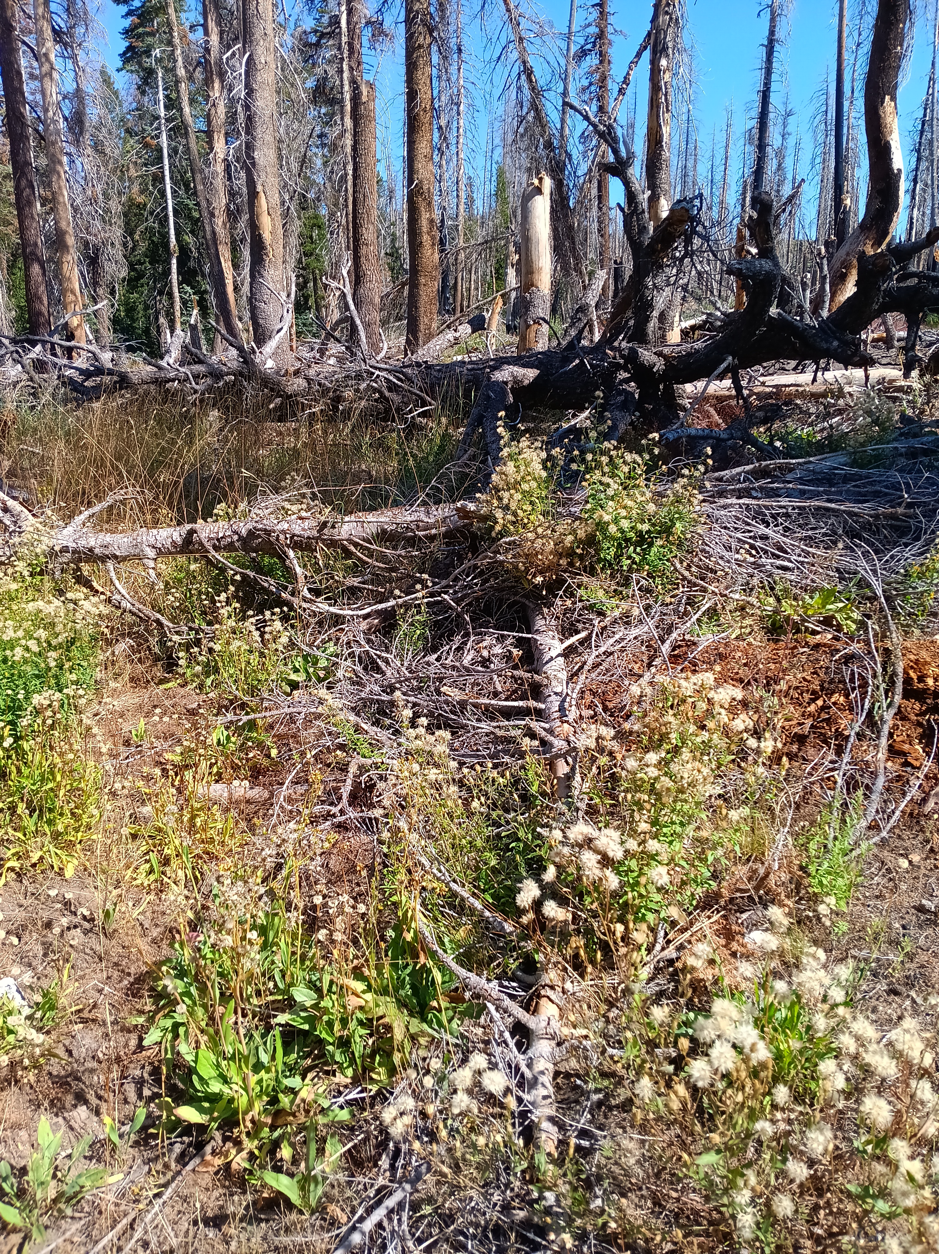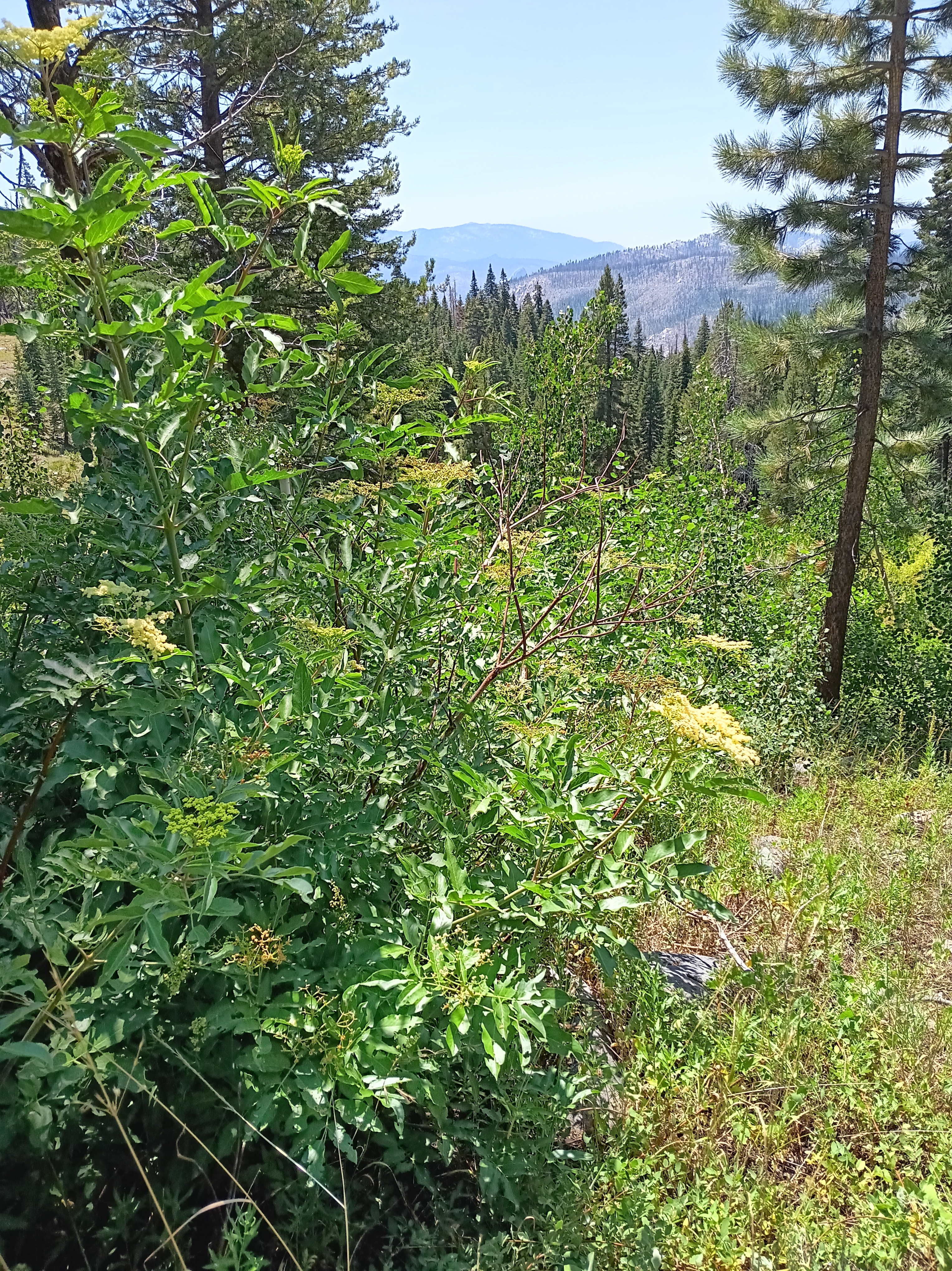 The sun emerged again the next day (Aug.-25), but the trail disappeared again within an hour from camp, but now I was in a dry forest that had not been burnt too badly and the map told me to go uphill. I did so for most of the day getting away from the treacherous San Joaquin River. Trouble awaited only in the meadows as here the terrain was wet, level, and overgrown with brush. My spirits lifted, however, when I noticed wild Elderberries. The photo above (bottom left) shows their blossoms, but later I found big, dark, black elderberries that I devoured after cooking them. The names of the meadows in the forest without a trail invoked emotions, too, such as “Naked Lady Meadow” followed by “Earthquake Meadow” followed by “Headquarters Meadow” followed by “Corral Meadow” followed by “Cargyle Meadow” before I reached a meadow without a name at the end of the day. These names tell me that people traveled and lived here in the past. There probably are stories that I do not yet know.