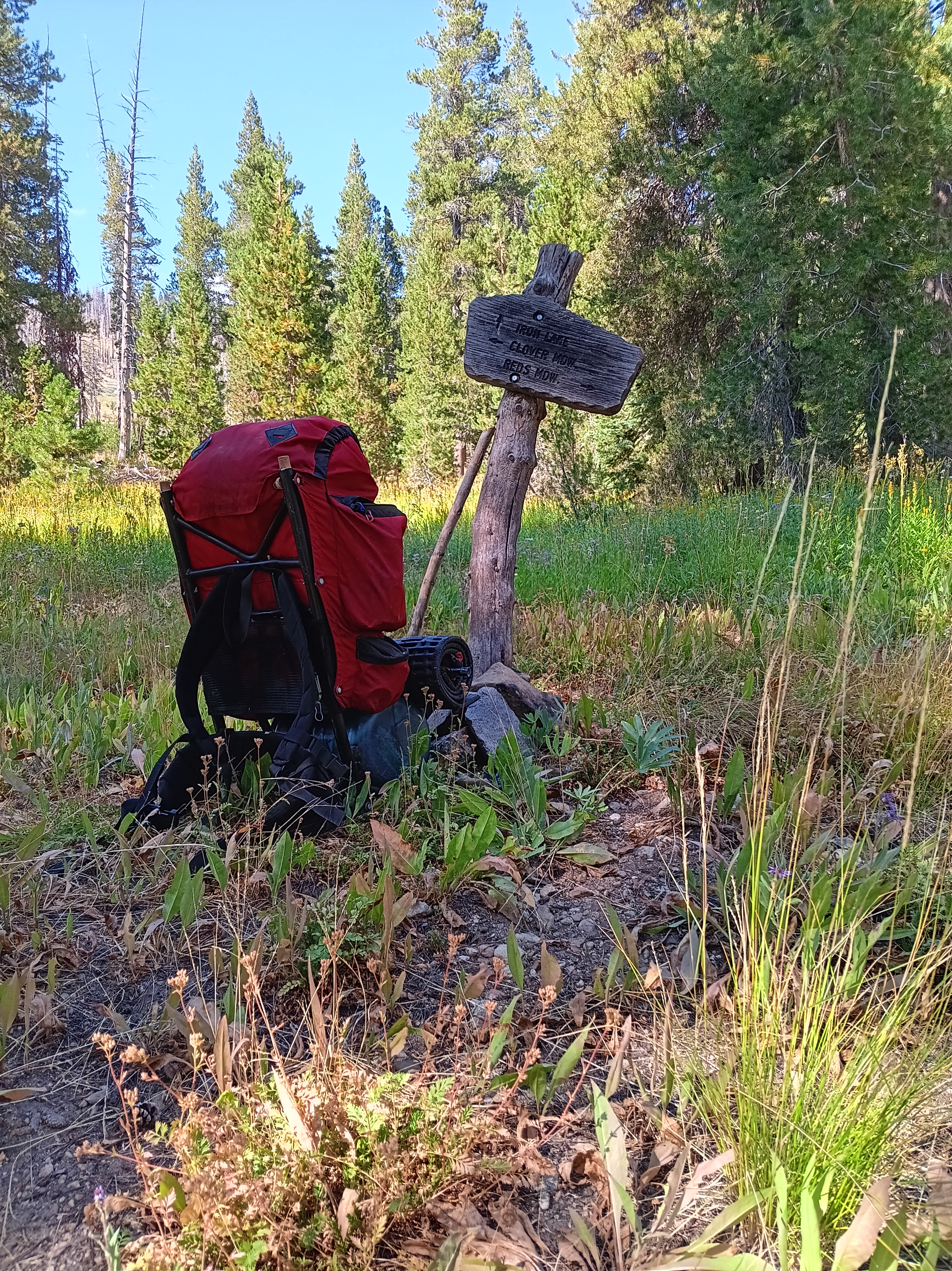 My senses sharpened during this day without a trail as I noticed more and more fallen tree logs that had a flat cut surface. At first I recorded each such sighting with its GPS position, but over time I could tell where they were. In the middle of these wild wanderings along a disappeared trail, I found this sign post (top left below) pointing out that this is the intersection of the trail to Mammouth Lakes to the right and Iron Mountain straight ahead. My navigation was good, but the so-called trail after this point was just one pile of wood after another pile of wood where I had to climb over, under, or walk around. Looking back, I find it amazing what one gets used to and how much punishment my then 62-year old body was able to take. After 10 miles of this I made camp at the unnamed meadow at 8,577′ (2610 m) below “Stairway Meadow,” “Granite Stairway,” and “Summit Meadow.” After that, a JMT-type trail emerged that led me down the mountain for 8 fast and furious miles downhill to Reds Meadow. Here civilization expressed itself in the form of a shower, beer, and double cheeseburger in that order. These last 8 miles passed faster than the prior 2 miles navigating wood piles:
