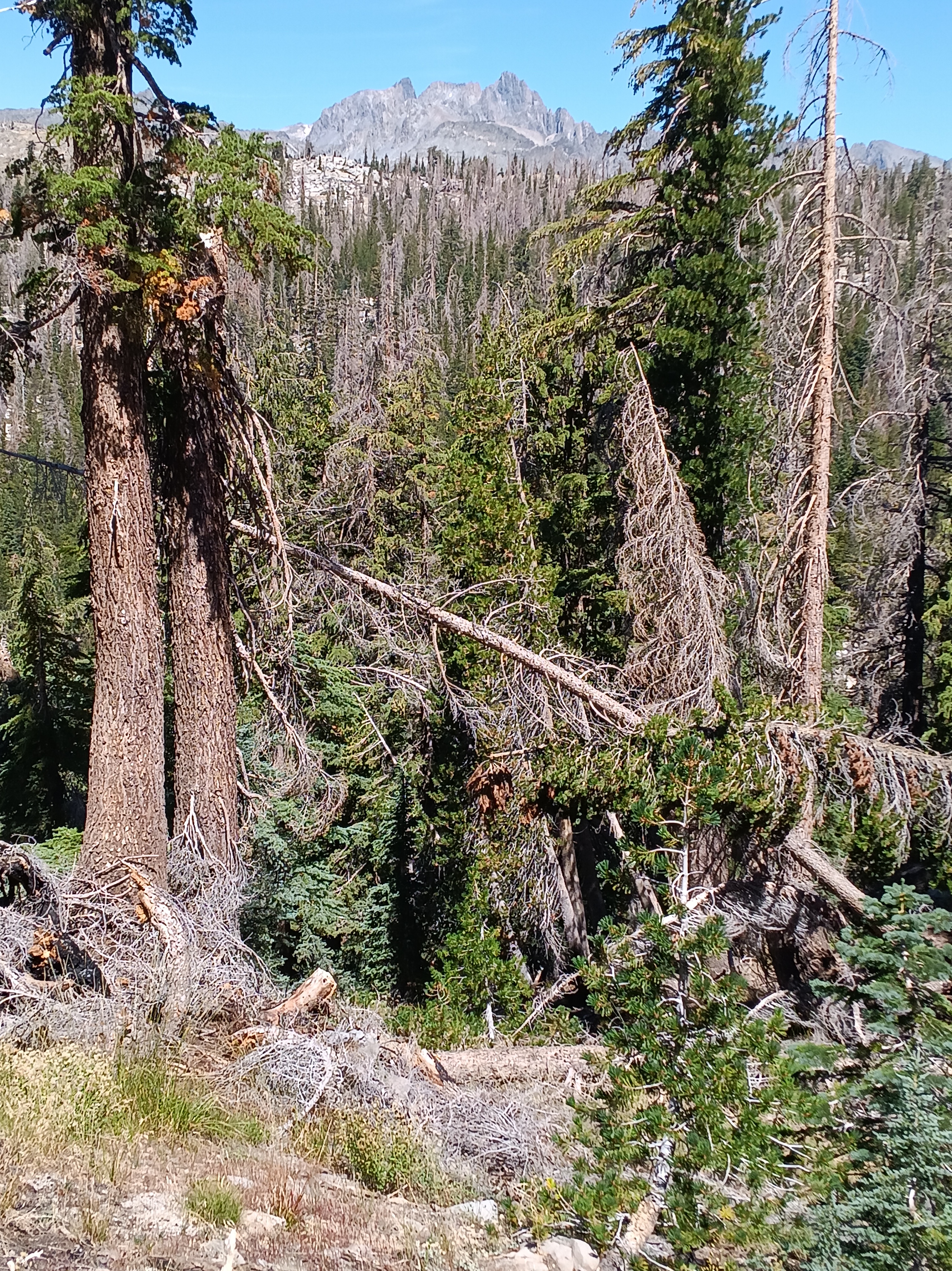 Almost immediately after crossing Isberg Pass, the trail disappeared. No problem here, because at ~11,000′ one is well above the tree line and thus sees clearly where one has to go. It is not hard to boulder over large rocks or walk on flat benches of granite or stroll down gently sloping dry stream beds. Furthermore, as soon as the trees reappeared near 9,500′ the trail reappears also. About half way between Isberg Pass and its trailhead near Clover Meadow Ranger Station I met the last group of people for the next 3 days. They were led by a “preacher” my age (63 years) without a backpack and four disciples ~20 years younger who carried heavy loads for their 4-5 day “revival” at Turner Lake in Yosemite. They were friendly, tried to convert me with good humor, and we talked for about 20-30 minutes about nature, god, and life as we know it, but then they headed up towards Isberg Pass and Yosemite while I headed down towards Bugg Meadow and Devils Postpile. All good.