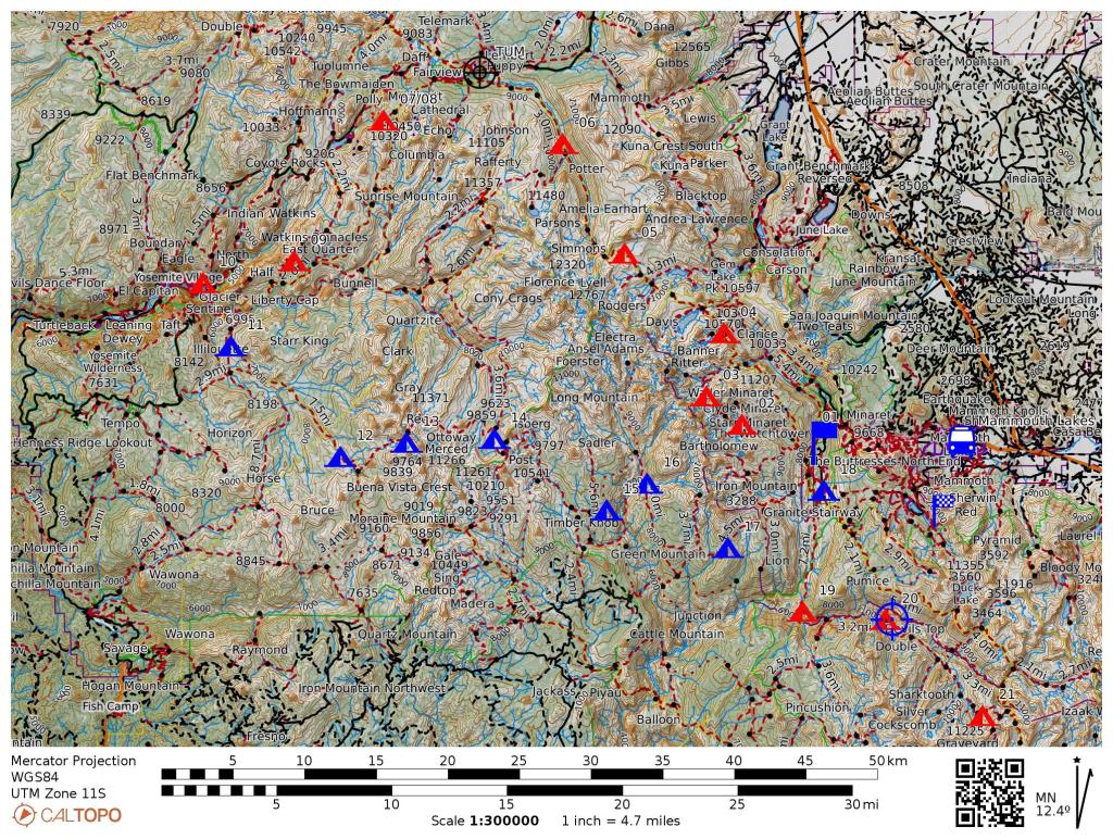 My 2024 loop through Yosemite National Park. I acclimated at Mammouth Lakes (blue bus) for 2 days and took a city bus to my trailhead at Devils Postpile (blue flag). From there I hiked north to Yosemite Village via Donahue Pass along 8 campsites (red tents). This was my first permit. The second permit carried me from Yosemite Village via Red Peak Pass and Isberg Pass along another 8 campsites (blue tents) back to Mammouth Lakes. Subsequently, I continued walking on the same second permit south loosely following the John Muir Trail (JMT) and past it to Horseshoe Meadow near Lone Pine, CA.